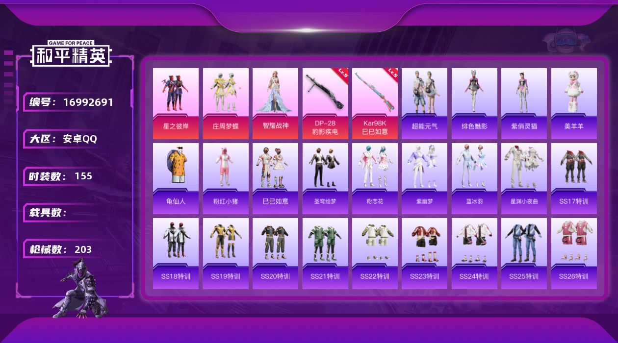 [16992691]安卓 手Q-3粉装-3特效枪-0载具-2粉色飞行器-54502热力值-18王牌印记-155套装-203枪皮 【热门品类】:套装-龟仙人,套装-粉红小猪 【粉色套装】:粉装-星之彼岸,粉装-庄周梦蝶,角色-智耀战神 【粉色枪皮等级】:Kar98K-巳巳如意(五级),DP-28-豹影疾电(五级) 【粉色枪皮】:Kar98K-巳巳如意,Mk14-福马献瑞,DP-28-豹影疾电 【粉色飞行器】:炫彩糖果飞行器,闪光银龙飞行器 【粉色降落伞】:绝对恒星降落伞,星之彼岸降落伞,妙趣可丽降落伞,冷漠罗丽降落伞,喜羊羊与灰太狼降落伞,极意拳锋降落伞,炫彩糖果降落伞 【稀有套装】:套装-龟仙人,套装-巳巳如意,套装-圣穹绘梦,套装-超能元气,套装-雪国风尚,套装-炫彩糖果,套装-粉恋花,套装-紫幽梦,套装-蓝冰羽,套装-星渊小夜曲,玩偶服-美羊羊,角色-绯色魅影,角色-紫俏灵猫 【稀有枪皮】:AUG-冰晶雪宝,AKM-墨染幽兰,AKM-彩虹符号,AKM-灼热熔岩,AKM-生命誓言,AKM-破晓战魂,AKM-龙的传人,M16A4-幻世战舞者,M16A4-甜心亚梦,M16A4-红色方程式,M16A4-蓝色火焰,SCAR-L-夜灯,SCAR-L-炫彩节奏,SCAR-L-玉兔迎春,SCAR-L-红色方程式,M416-糯团青竹,M416-红色方程式,M416-绯红前夜,M416-蓝色火焰,GROZA-异彩先驱,GROZA-恐龙拽拽,GROZA-懵萌河马,AUG-天降萌叽,AUG-耀粉歌者,AUG-绝对恒星,QBZ-彩虹符号,QBZ-飞驰魅影,M762-天降萌叽,M762-彩虹符号,M762-第五大道,Mk47-妙红点点,G36C-懵萌河马,G36C-星穹咏叹调,AC-VAL-甜心亚梦,蜜獾-天降萌叽,蜜獾-娇憨猪猪,UZI-啾咪啾咪,UZI-娇憨猪猪,UZI-炫彩节奏,UZI-红色方程式,UMP45-夜灯,UMP45-涂山之恋,UMP45-生命誓言,UMP45-蓝色火焰,UMP45-诡娃娃,Vector-生命誓言,汤姆逊-异彩先驱,汤姆逊-炫彩节奏,汤姆逊-环太平洋,汤姆逊-耀粉歌者,MP5K-异彩先驱,AKS-74U-辉羽雀灵,P90-筑梦精灵,P90-飞驰魅影,P90-巳巳如意,Kar98K-炫彩节奏,Kar98K-红色方程式,Kar98K-飞驰魅影,Kar98K-星穹咏叹调,M24-炫