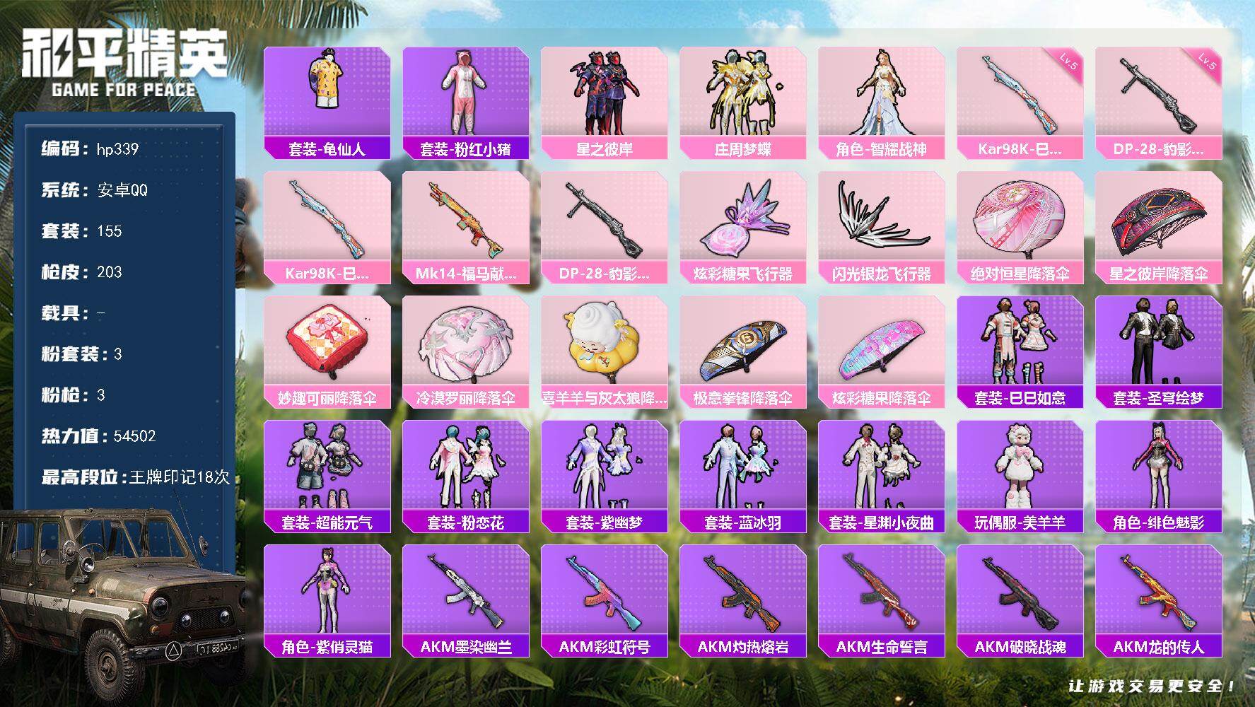 [16992691]安卓 手Q-3粉装-3特效枪-0载具-2粉色飞行器-54502热力值-18王牌印记-155套装-203枪皮
