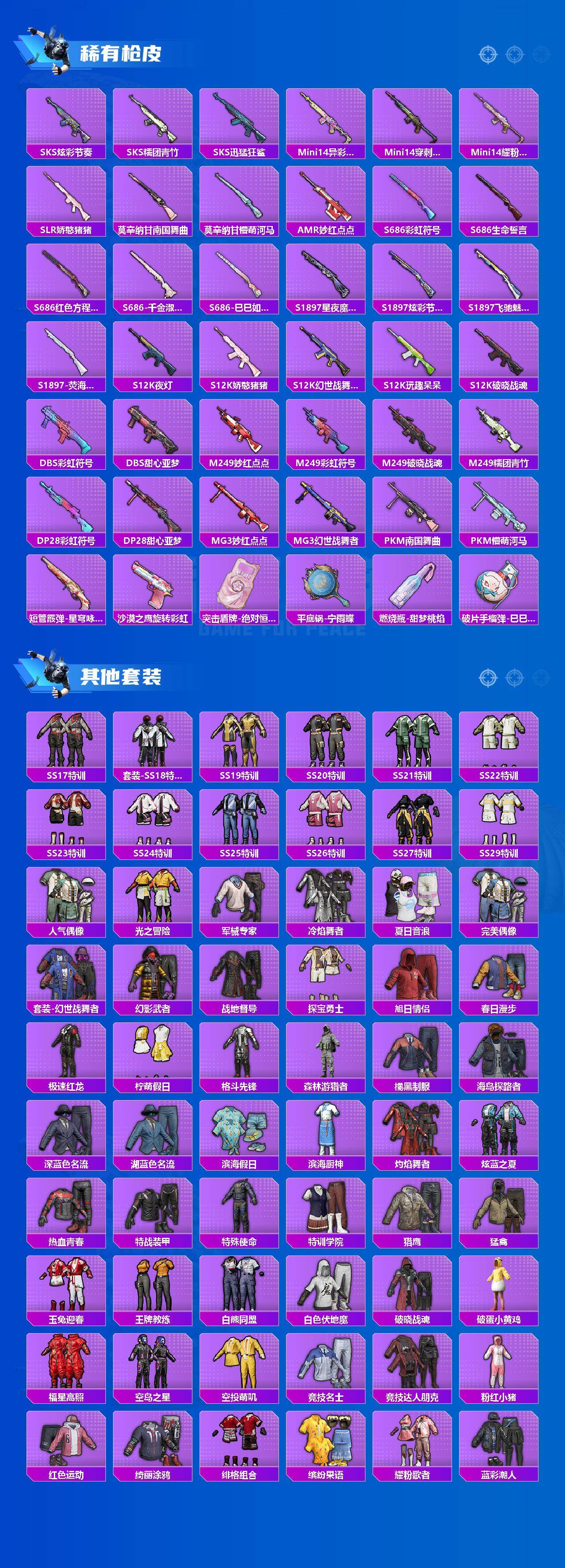 【稀有枪皮】:AUG-冰晶雪宝,AKM-墨染幽兰,AKM-彩虹符号,AKM-灼热熔岩,AKM-生命誓言,AKM-破晓战魂,AKM-龙的传人,M16A4-幻世战舞者,M16A4-甜心亚梦,M16A4-红色方程式,M16A4-蓝色火焰,SCAR-L-夜灯,SCAR-L-炫彩节奏,SCAR-L-玉兔迎春,SCAR-L-红色方程式,M416-糯团青竹,M416-红色方程式,M416-绯红前夜,M416-蓝色火焰,GROZA-异彩先驱,GROZA-恐龙拽拽,GROZA-懵萌河马,AUG-天降萌叽,AUG-耀粉歌者,AUG-绝对恒星,QBZ-彩虹符号,QBZ-飞驰魅影,M762-天降萌叽,M762-彩虹符号,M762-第五大道,Mk47-妙红点点,G36C-懵萌河马,G36C-星穹咏叹调,AC-VAL-甜心亚梦,蜜獾-天降萌叽,蜜獾-娇憨猪猪,UZI-啾咪啾咪,UZI-娇憨猪猪,UZI-炫彩节奏,UZI-红色方程式,UMP45-夜灯,UMP45-涂山之恋,UMP45-生命誓言,UMP45-蓝色火焰,UMP45-诡娃娃,Vector-生命誓言,汤姆逊-异彩先驱,汤姆逊-炫彩节奏,汤姆逊-环太平洋,汤姆逊-耀粉歌者,MP5K-异彩先驱,AKS-74U-辉羽雀灵,P90-筑梦精灵,P90-飞驰魅影,P90-巳巳如意,Kar98K-炫彩节奏,Kar98K-红色方程式,Kar98K-飞驰魅影,Kar98K-星穹咏叹调,M24-炫