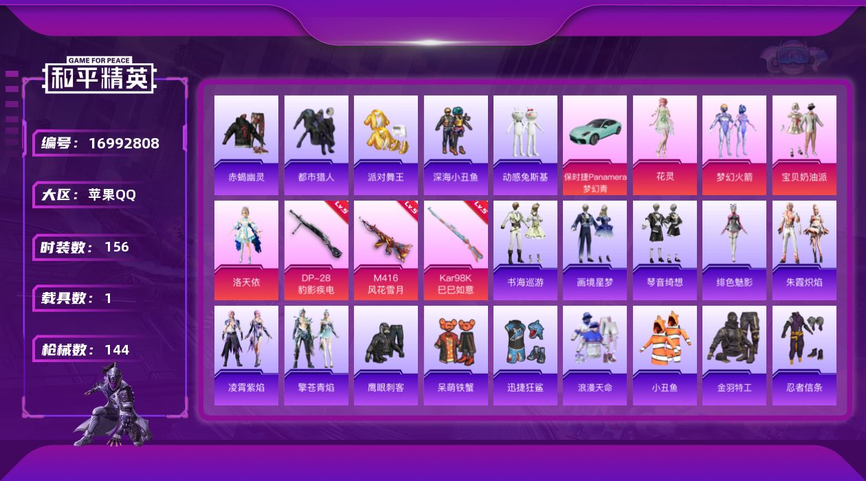 [16992808]苹果 手Q-4粉装-4特效枪-1载具-1粉色飞行器-43586热力值-4王牌印记-156套装-144枪皮