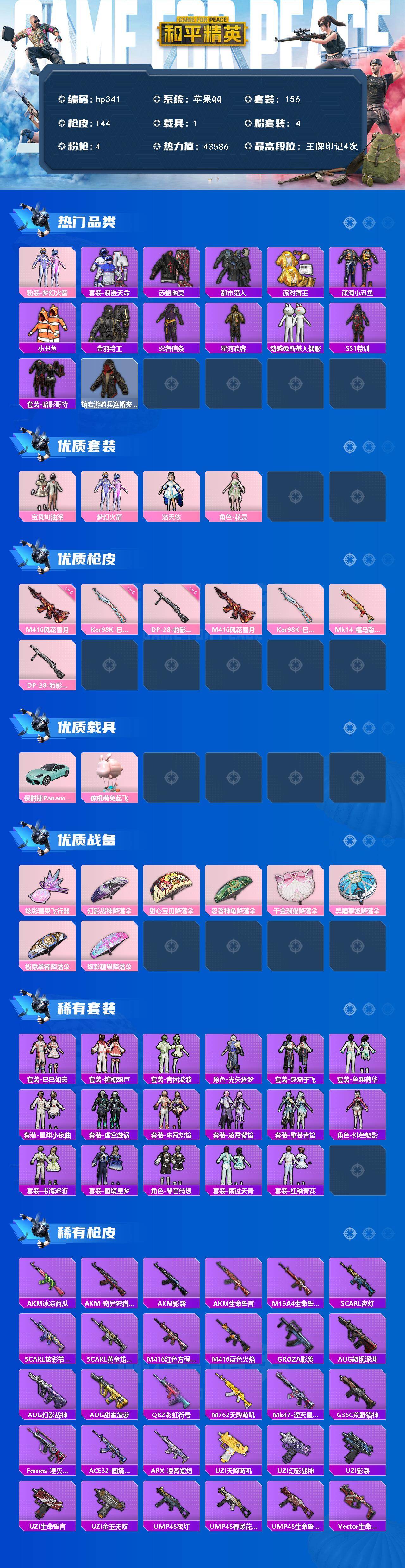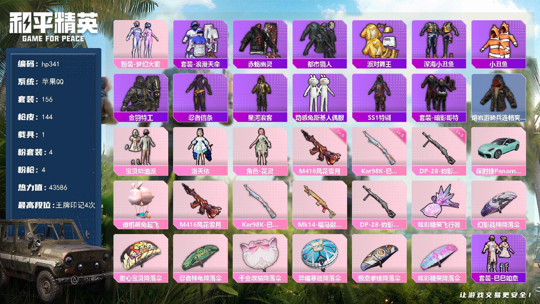 [16992808]苹果 手Q-4粉装-4特效枪-1载具-1粉色飞行器-43586热力值-4王牌印记-156套装-144枪皮 【热门品类】:粉装-梦幻火箭,套装-浪漫天命,套装-赤蝎幽灵,套装-都市猎人,套装-派对舞王,套装-深海小丑鱼,套装-小丑鱼,套装-金羽特工,套装-忍者信条,套装-星河浪客,套装-动感兔斯基人偶服,套装-SS1特训,套装-暗影哥特,熔岩游骑兵连帽夹克 【粉色套装】:粉装-宝贝奶油派,粉装-梦幻火箭,角色-洛天依,角色-花灵 【粉色枪皮等级】:M416-风花雪月(五级),Kar98K-巳巳如意(五级),DP-28-豹影疾电(五级) 【粉色载具】:保时捷Panamera(梦幻青),僚机-萌兔起飞 【粉色枪皮】:M416-风花雪月,Kar98K-巳巳如意,Mk14-福马献瑞,DP-28-豹影疾电 【粉色飞行器】:炫彩糖果飞行器 【粉色降落伞】:幻影战神降落伞,甜心宝贝降落伞,忍者神龟降落伞,千金淑猫降落伞,异瞳寒姬降落伞,极意拳锋降落伞,炫彩糖果降落伞 【稀有套装】:套装-巳巳如意,套装-雪国风尚,套装-炫彩糖果,套装-糖糖葫芦,套装-青团波波,角色-光矢逐梦,套装-燕燕于飞,套装-鱼渊荷华,套装-星渊小夜曲,套装-虚空漩涡,套装-朱霞炽焰,套装-凌霄紫焰,套装-擎苍青焰,角色-绯色魅影,套装-书海巡游,套装-画境星梦,套装-琴音绮想,套装-雨过天青,套装-红釉青花 【稀有枪皮】:AUG-冰晶雪宝,AKM-冰凉西瓜,AKM-奇异狩猎者,AKM-影袭,AKM-生命誓言,M16A4-生命誓言,SCAR-L-夜灯,SCAR-L-炫彩节奏,SCAR-L-黄金龙骨,M416-红色方程式,M416-蓝色火焰,GROZA-影袭,AUG-凝视深渊,AUG-幻影战神,AUG-甜蜜菠萝,QBZ-彩虹符号,M762-天降萌叽,Mk47-湮灭星辰,G36C-荒野猎神,Famas-湮灭星辰,ACE32-画境星梦,ARX-凌霄紫焰,UZI-天降萌叽,UZI-幻影战神,UZI-影袭,UZI-生命誓言,UZI-金玉无双,UMP45-夜灯,UMP45-春暖花开,UMP45-生命誓言,Vector-生命誓言,汤姆逊-天降萌叽,MP5K-画境星梦,JS9-凌霄紫焰,P90-巳巳如意,Kar98K-幻影战神,Kar98K-影袭,M24-影袭,M24-冰封烈焰,AWM-荒野猎神,SKS-炫彩节奏,SKS-迅
