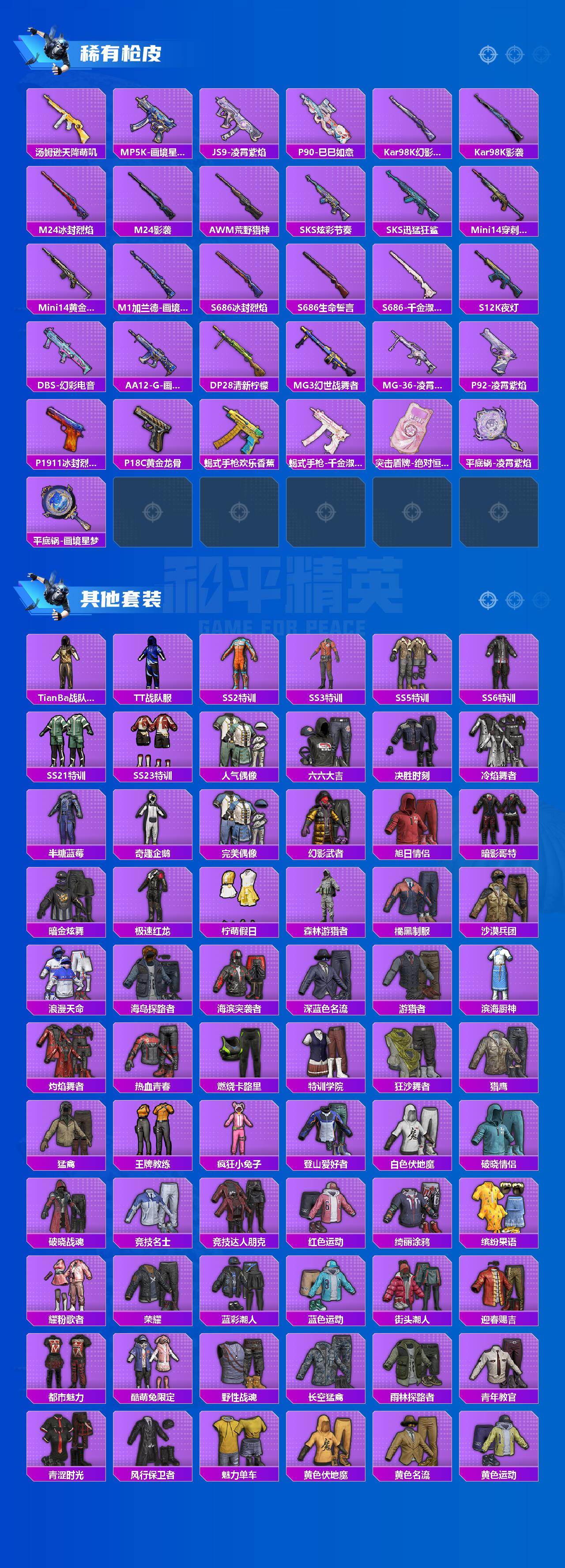 【稀有枪皮】:AUG-冰晶雪宝,AKM-冰凉西瓜,AKM-奇异狩猎者,AKM-影袭,AKM-生命誓言,M16A4-生命誓言,SCAR-L-夜灯,SCAR-L-炫彩节奏,SCAR-L-黄金龙骨,M416-红色方程式,M416-蓝色火焰,GROZA-影袭,AUG-凝视深渊,AUG-幻影战神,AUG-甜蜜菠萝,QBZ-彩虹符号,M762-天降萌叽,Mk47-湮灭星辰,G36C-荒野猎神,Famas-湮灭星辰,ACE32-画境星梦,ARX-凌霄紫焰,UZI-天降萌叽,UZI-幻影战神,UZI-影袭,UZI-生命誓言,UZI-金玉无双,UMP45-夜灯,UMP45-春暖花开,UMP45-生命誓言,Vector-生命誓言,汤姆逊-天降萌叽,MP5K-画境星梦,JS9-凌霄紫焰,P90-巳巳如意,Kar98K-幻影战神,Kar98K-影袭,M24-影袭,M24-冰封烈焰,AWM-荒野猎神,SKS-炫彩节奏,SKS-迅