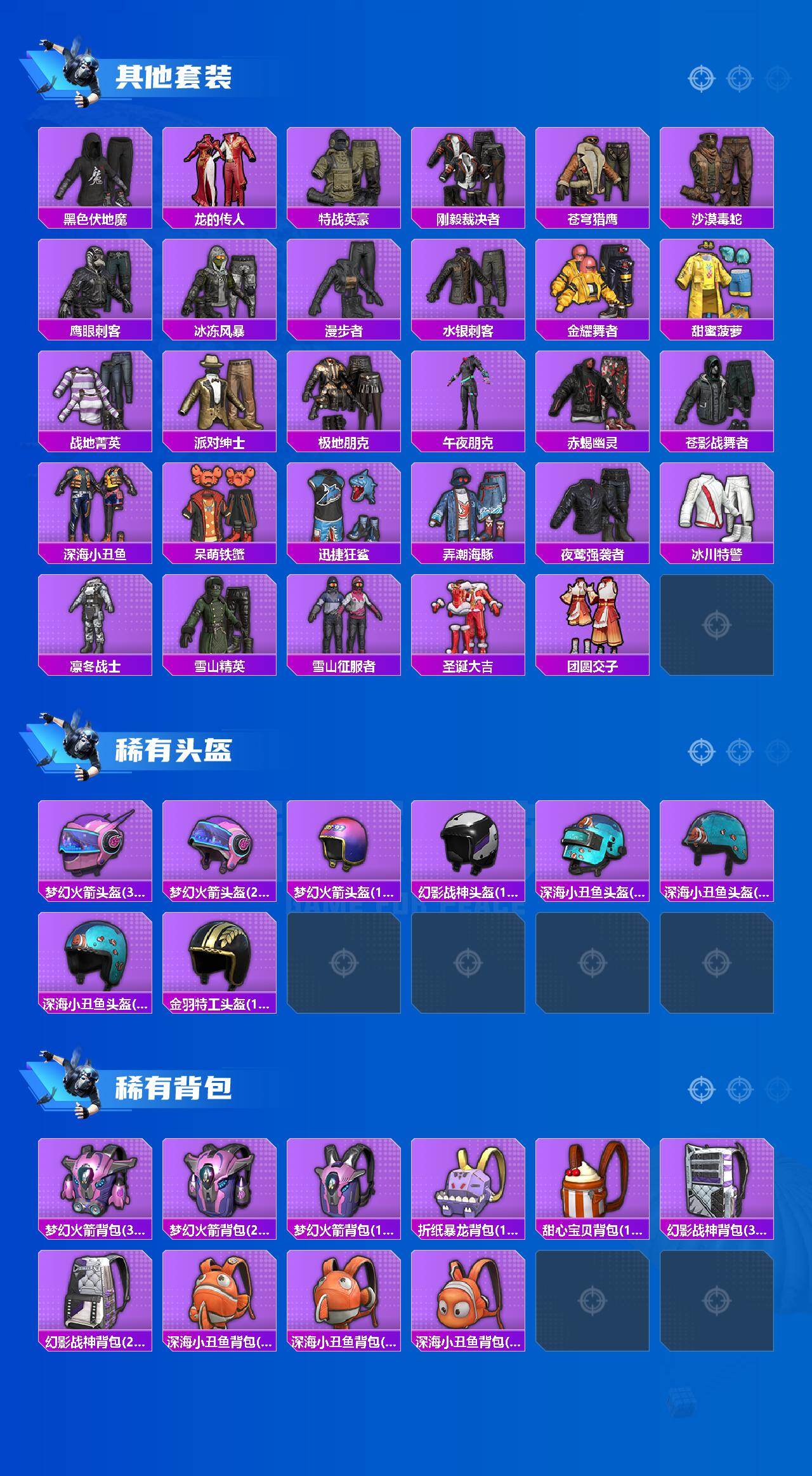 - [11883845]11粉装 5特效枪 1载具 8印记 可二次 可修改实名 身法装备:赤蝎幽灵,都市猎人,舞王派对(派对舞王、小金鞋),暗影哥特(红眼罩) 优质装备:永恒黄蜂,舞王派对(派对舞王、小金鞋),赤蝎幽灵,都市猎人,梦幻火箭(新101)(新火箭少女101粉色套装),极限特训,天使彩虹糖,M416风花雪月,洛天依,M762苔丝玫瑰,SCAR-L-锦绣绵绵,七级M762-苔丝玫瑰,七级M416-风花雪月,女娲灵识,雪月幻音,Kar98K-巳巳如意 热门装扮:焦糖拿铁,桃夭倾城,光明术士,炫光之旅,暖暖奶龙,迅捷狂鲨,鹰眼刺客,呆萌铁蟹,深海小丑鱼,东方飞龙,都市猎人,派对舞王(小金鞋),赤蝎幽灵 稀有枪皮:DP-28-豹影疾电 五级特效枪:五级Kar98K-巳巳如意,五级DP-28-豹影疾电,五级SCAR-L-锦绣绵绵 紫色装扮:星夜迷魅,琉璃情波,田园牧歌,轻风白浪,SS22特训,莱茵河畔,SS23特训,幻彩翩翩,娇憨猪猪,萌趣咩咩,SS21特训,极光玫瑰,艾菲玫瑰,绚烂繁星,SS31特训套装,千禧之恋,旭日情侣,SS33特训套装,青涩时光,顶瓜瓜,冰爽风暴,音速流光,SS19特训,吉莉礼服,电音精灵,瑞龙福将,团圆交子,SS17特训,魔力冰咖,异彩先驱,SS18特训,都市漫游者,长空猛禽,雪鹰学院,霓虹极客,霓虹街区,青年教官,迎春赐吉,缤纷果语,魅力单车,麻辣教官,黄色伏地魔,黄色运动,黑色伏地魔,龙的传人,龟仙人,龙魂突击队,极地朋克,海岛探路者,深蓝色名流,夏日倾情,湖蓝色名流,绮丽涂鸦,空岛之星,空投萌叽,王牌教练,牛气冲天,白光莹,SS28特训,卖崽青蛙,李逍遥,冰公主,异域银装,鱼渊荷华,玉兔迎春,燕燕于飞,竞技名士,暗影哥特(红眼罩),深海梦境,惊鸿侠骨,SS25特训,金戈铁马,锦衣飞扬,焰鹰斗篷,幻羽潜行,幽夜迷踪,SS27特训,无暇誓言,金羽特工,浪漫天命,日照花林,SS26特训,春光漫游,快闪甜心,贝斯之夜,智谋强哥,晶辉守护,摩艾涂鸦,奇趣章鱼,星谷精灵,耀粉歌者,粉恋花,蓝冰羽,紫幽梦,SS32特训服(SS32特训套装),瑰梦爱神,绯格组合,蜜桃派对,新风雅兰,恋语绒绒,漫步者,冷酷挑战者,冰冻风暴,弄潮海豚,光之冒险 优质战备:圣堂之誓降落伞,萌物绒绒飞行器,鬼刀降落伞,金蛇镇世降落伞,赛博古神降落伞,智耀战神降落伞,樱桃泡泡降落伞,极限特训降落
