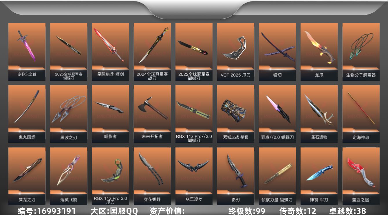 [16993191]【极品素材号/店主推荐捡漏号】}【套装】:2025全球冠军赛套装,2024全球冠军赛套装,2022全球冠军赛套装,上古龙炎套装,多弥尔的复仇套装,噬影者套装,VCT 2025 赛季套装,西部未来套装,创·纪元套装,RGX 11z Pro//3.0套装,《双城之战》收藏套装,奇点//2.0套装,回火礼包:奇点套装,般若假面//2.0套装,异鳞魔蛇套装,掠影套装,黑市套装,英雄之选套装,手工达人套装,琉璃幻梦套装【英雄】:幻棱,炼狱,维斯,暮蝶,钛狐,壹决,铁臂,捷风,雷兹,幽影,不死鸟,贤者,猎枭,蝰蛇,零,芮娜,奇乐,尚勃勒,霓虹,斯凯,夜露,星礈,K/O,海神,盖可,黑梦,钢锁【近战武器】:近战武器-2025全球冠军赛 蝴蝶刀,近战武器-2024全球冠军赛 战刀,近战武器-2022全球冠军赛 蝴蝶刀,近战武器-多弥尔之裁,近战武器-穿花蝴蝶,近战武器-RGX 11z Pro//2.0 蝴蝶刀,近战武器-侦察力量 蝴蝶刀,近战武器-奇点//2.0 蝴蝶刀,近战武器-VCT 2025 爪刀,近战武器-紫金爪刀,近战武器-RGX 11z Pro//3.0 爪刀,近战武器-黑波之刃,近战武器-落英飞旋,近战武器-噬影者 簇刃,近战武器-镭切,近战武器-威龙之刃,近战武器-澄湖潋滟,近战武器-夜之蝴蝶,近战武器-鬼丸国纲,近战武器-双生獠牙,近战武器-双城之战 拳套,近战武器-未来开拓者,近战武器-巨神铁甲 短剑,近战武器-龙爪,近战武器-般若长牙,近战武器-彩虹魔力大棒槌,近战武器-超限闪存 匕首,近战武器-超越极限 球棒,近战武器-定海神珍,近战武器-堕天遗武 仪式匕首,近战武器-盖亚之愠,近战武器-硅晶刻刀,近战武器-金角扇,近战武器-琉璃锻梦剑,近战武器-魄月玄刃,近战武器-神罚 军刀,近战武器-生物分子解离器,近战武器-圣石遗物,近战武器-视界洞穿,近战武器-手工达人 战斧,近战武器-天玄刀,近战武器-影刃,近战武器-诡秘蛇影 军刀,近战武器-日耀风暴 遗器,近战武器-星际猎兵 短剑【狂徒】:狂徒-艾沃莉的梦之翼,狂徒-上古龙炎,狂徒-2025全球冠军赛,狂徒-光明哨兵,狂徒-归零者,狂徒-洪荒怒焰,狂徒-混沌序曲,狂徒-机动狂飙,狂徒-奇点//2.0,狂徒-双城之战,狂徒-塑水宗,狂徒-创·纪元,狂徒-噬影者,狂徒-多弥尔的复仇,狂徒-ORA x 颗秒,狂徒-