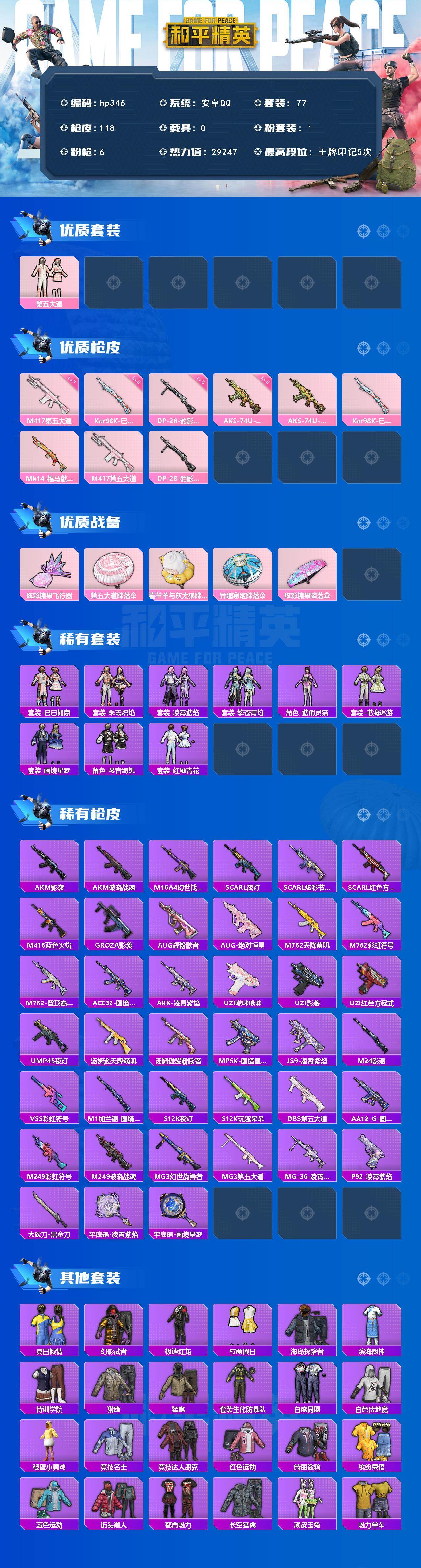 [16993260]安卓 手Q-1粉装-6特效枪-0载具-1粉色飞行器-29247热力值-5王牌印记-77套装-118枪皮 【粉色套装】:粉装-第五大道 【粉色枪皮等级】:AKS-74U-森灵之息(五级),Kar98K-巳巳如意(五级),M417-第五大道(七级),DP-28-豹影疾电(五级) 【粉色枪皮】:AKS-74U-森灵之息,Kar98K-巳巳如意,Mk14-福马献瑞,M417-第五大道,DP-28-豹影疾电 【粉色飞行器】:炫彩糖果飞行器 【粉色降落伞】:第五大道降落伞,喜羊羊与灰太狼降落伞,异瞳寒姬降落伞,炫彩糖果降落伞 【稀有套装】:套装-巳巳如意,套装-雪国风尚,套装-炫彩糖果,套装-朱霞炽焰,套装-凌霄紫焰,套装-擎苍青焰,角色-紫俏灵猫,套装-书海巡游,套装-画境星梦,套装-琴音绮想,套装-红釉青花 【稀有枪皮】:AUG-冰晶雪宝,AKM-影袭,AKM-破晓战魂,M16A4-幻世战舞者,SCAR-L-夜灯,SCAR-L-炫彩节奏,SCAR-L-红色方程式,M416-蓝色火焰,GROZA-影袭,AUG-耀粉歌者,AUG-绝对恒星,M762-天降萌叽,M762-彩虹符号,M762-登顶巅峰,ACE32-画境星梦,ARX-凌霄紫焰,UZI-啾咪啾咪,UZI-影袭,UZI-红色方程式,UMP45-夜灯,汤姆逊-天降萌叽,汤姆逊-耀粉歌者,MP5K-画境星梦,JS9-凌霄紫焰,M24-影袭,VSS-彩虹符号,M1加兰德-画境星梦,S12K-玩趣呆呆,S12K-夜灯,DBS-第五大道,AA12-G-画境星梦,M249-彩虹符号,M249-破晓战魂,MG3-幻世战舞者,MG3-第五大道,MG-36-凌霄紫焰,P92-凌霄紫焰,大砍刀-黑金刀,平底锅-凌霄紫焰,平底锅-画境星梦 【其他套装】:套装-夏日倾情,套装-幻影武者,套装-极速红龙,套装-柠萌假日,套装-海岛探路者,套装-滨海厨神,套装-特训学院,套装-猎鹰,套装-猛禽,套装-生化防暴队,套装-白熊同盟,套装-白色伏地魔,套装-破蛋小黄鸡,套装-竞技名士,套装-竞技达人朋克,套装-红色运动,套装-绮丽涂鸦,套装-缤纷果语,套装-蓝色运动,套装-街头潮人,套装-都市魅力,套装-长空猛禽,套装-顽皮玉兔,套装-魅力单车,套装-黄色伏地魔,套装-黄色运动,套装-黑色伏地魔,套装-龙的传人,套装-鹰眼刺客,套装-冰冻风暴,套装-漫