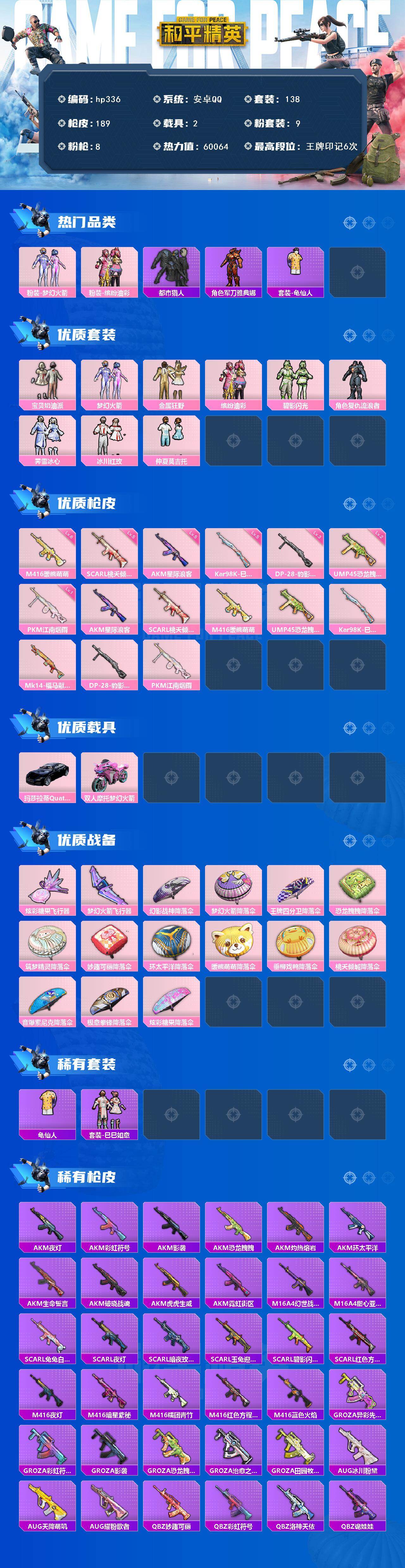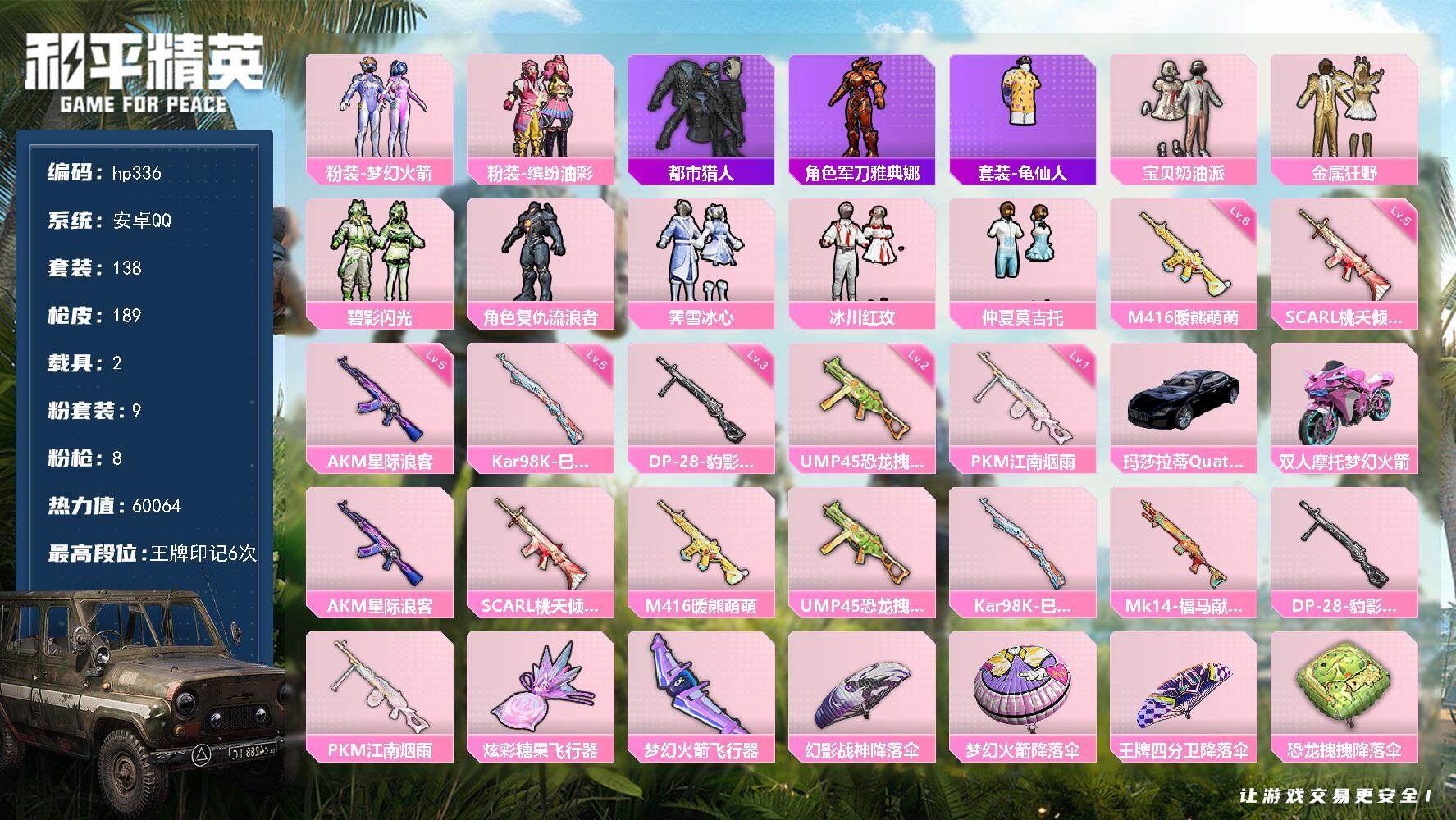 [16993429]安卓 手Q-9粉装-8特效枪-2载具-2粉色飞行器-60064热力值-6王牌印记-138套装-189枪皮 【热门品类】:粉装-梦幻火箭,粉装-缤纷油彩,套装-都市猎人,角色-军刀雅典娜,套装-龟仙人 【粉色套装】:粉装-宝贝奶油派,粉装-梦幻火箭,粉装-金属狂野,粉装-缤纷油彩,粉装-碧影闪光,角色-复仇流浪者,粉装-霁雪冰心,粉装-冰川红玫,粉装-仲夏莫吉托 【粉色枪皮等级】:AKM-星际浪客(五级),SCAR-L-桃夭倾城(五级),M416-暖熊萌萌(六级),UMP45-恐龙拽拽(二级),Kar98K-巳巳如意(五级),DP-28-豹影疾电(三级),PKM-江南烟雨(一级) 【粉色载具】:玛莎拉蒂Quattroporte(夜幕蓝),双人摩托-梦幻火箭 【粉色枪皮】:AKM-星际浪客,SCAR-L-桃夭倾城,M416-暖熊萌萌,UMP45-恐龙拽拽,Kar98K-巳巳如意,Mk14-福马献瑞,DP-28-豹影疾电,PKM-江南烟雨 【粉色飞行器】:炫彩糖果飞行器,梦幻火箭飞行器 【粉色降落伞】:幻影战神降落伞,梦幻火箭降落伞,王牌四分卫降落伞,恐龙拽拽降落伞,筑梦精灵降落伞,妙趣可丽降落伞,环太平洋降落伞,暖熊萌萌降落伞,垂柳戏鸭降落伞,桃夭倾城降落伞,音爆索尼克降落伞,极意拳锋降落伞,炫彩糖果降落伞 【稀有套装】:套装-龟仙人,套装-巳巳如意 【稀有枪皮】:AKM-夜灯,AKM-彩虹符号,AKM-影袭,AKM-恐龙拽拽,AKM-灼热熔岩,AKM-环太平洋,AKM-生命誓言,AKM-破晓战魂,AKM-虎虎生威,AKM-霓虹街区,M16A4-幻世战舞者,M16A4-甜心亚梦,SCAR-L-兔兔白日梦,SCAR-L-夜灯,SCAR-L-暗夜玫瑰,SCAR-L-玉兔迎春,SCAR-L-碧影闪光,SCAR-L-红色方程式,M416-夜灯,M416-暗星紫秘,M416-糯团青竹,M416-红色方程式,M416-蓝色火焰,GROZA-异彩先驱,GROZA-彩虹符号,GROZA-影袭,GROZA-恐龙拽拽,GROZA-治愈之星,GROZA-田园牧歌,AUG-冰川粉黛,AUG-天降萌叽,AUG-耀粉歌者,QBZ-妙趣可丽,QBZ-彩虹符号,QBZ-洛神天依,QBZ-诡娃娃,QBZ-飞驰魅影,M762-天降萌叽,M762-暖熊萌萌,M762-瑞龙福将,M762-绒雪飘舞,Mk47