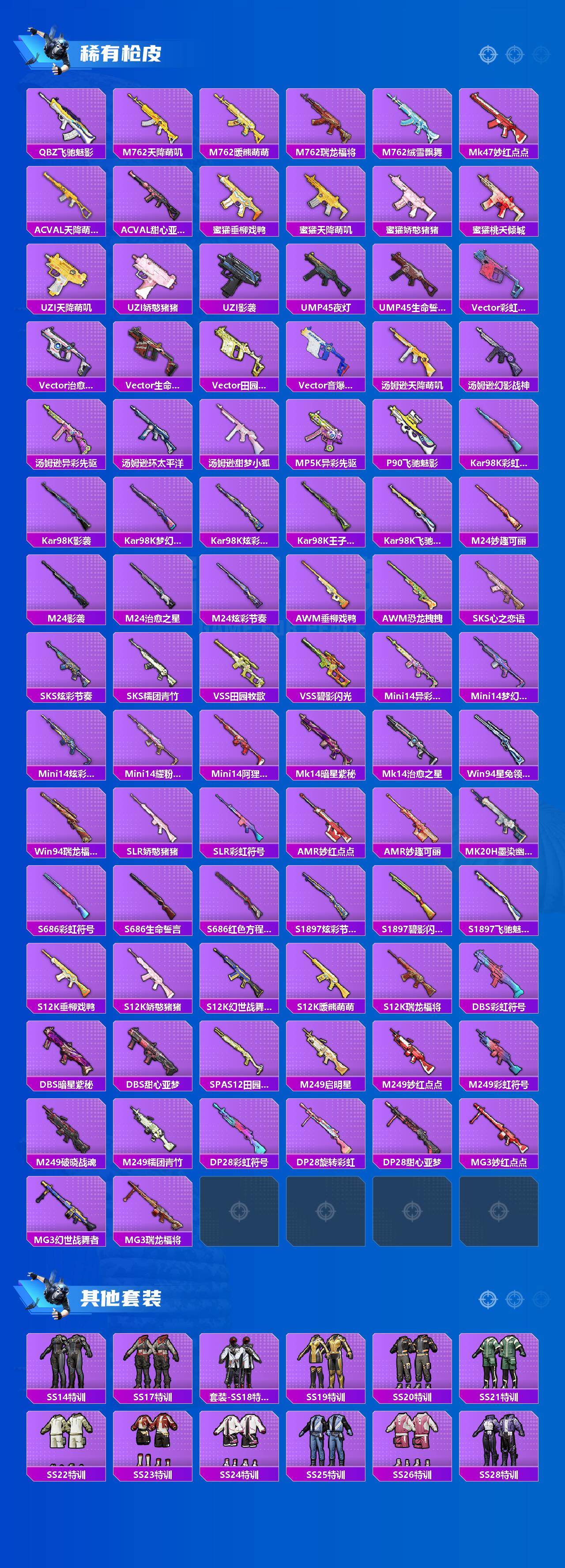 【稀有枪皮】:AKM-夜灯,AKM-彩虹符号,AKM-影袭,AKM-恐龙拽拽,AKM-灼热熔岩,AKM-环太平洋,AKM-生命誓言,AKM-破晓战魂,AKM-虎虎生威,AKM-霓虹街区,M16A4-幻世战舞者,M16A4-甜心亚梦,SCAR-L-兔兔白日梦,SCAR-L-夜灯,SCAR-L-暗夜玫瑰,SCAR-L-玉兔迎春,SCAR-L-碧影闪光,SCAR-L-红色方程式,M416-夜灯,M416-暗星紫秘,M416-糯团青竹,M416-红色方程式,M416-蓝色火焰,GROZA-异彩先驱,GROZA-彩虹符号,GROZA-影袭,GROZA-恐龙拽拽,GROZA-治愈之星,GROZA-田园牧歌,AUG-冰川粉黛,AUG-天降萌叽,AUG-耀粉歌者,QBZ-妙趣可丽,QBZ-彩虹符号,QBZ-洛神天依,QBZ-诡娃娃,QBZ-飞驰魅影,M762-天降萌叽,M762-暖熊萌萌,M762-瑞龙福将,M762-绒雪飘舞,Mk47