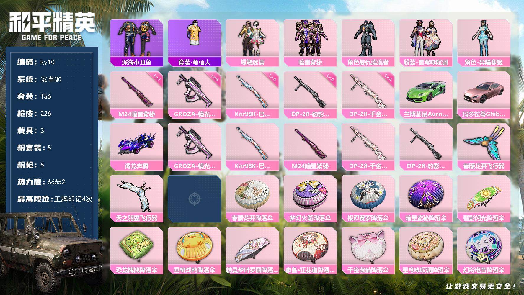 [16994070]安卓 手Q-5粉装-5特效枪-3载具-4粉色飞行器-66652热力值-4王牌印记-156套装-226枪皮 【热门品类】:套装-深海小丑鱼,套装-龟仙人 【粉色套装】:粉装-蝶舞迷情,粉装-暗星紫秘,角色-复仇流浪者,粉装-星穹咏叹调,角色-异瞳寒姬 【粉色枪皮等级】:GROZA-镜光银凌(五级),Kar98K-巳巳如意(五级),M24-暗星紫秘(七级),DP-28-千金淑猫(四级),DP-28-豹影疾电(五级) 【粉色载具】:兰博基尼Aventador SVJ(翡翠绿),玛莎拉蒂Ghibli(粉),海龙奔腾 【粉色枪皮】:GROZA-镜光银凌,Kar98K-巳巳如意,M24-暗星紫秘,DP-28-千金淑猫,DP-28-豹影疾电 【粉色飞行器】:春暖花开飞行器,天之羽翼飞行器,极意拳锋飞行器 【粉色降落伞】:春暖花开降落伞,梦幻火箭降落伞,银刃赛罗降落伞,暗星紫秘降落伞,碧影闪光降落伞,恐龙拽拽降落伞,垂柳戏鸭降落伞,精灵梦叶罗丽降落伞,拳皇·狂花道降落伞,千金淑猫降落伞,星穹咏叹调降落伞,幻彩电音降落伞,异瞳寒姬降落伞,炫彩糖果降落伞 【稀有套装】:套装-龟仙人,套装-绒宝小鹅,套装-巳巳如意,套装-雪国风尚,套装-炫彩糖果,套装-雏菊兔兔,套装-萝兰蝴蝶,套装-小熊娃娃,套装-糖糖葫芦,套装-青团波波,套装-棉花软糖,角色-都市丽猫,角色-摩登魅猫,套装-燕燕于飞,套装-鱼渊荷华,套装-紫幽梦,套装-蓝冰羽,套装-星影赞美诗,套装-霓虹热舞,套装-极速光影,角色-月烬之祷 【稀有枪皮】:AUG-冰晶雪宝,AKM-夜灯,AKM-奇异狩猎者,AKM-彩虹符号,AKM-影袭,AKM-春暖花开,AKM-破晓战魂,AKM-虎虎生威,AKM-霓虹街区,AKM-龙的传人,M16A4-幻世战舞者,M16A4-红色方程式,M16A4-蓝色火焰,M16A4-千金淑猫,SCAR-L-夜灯,SCAR-L-炫彩节奏,SCAR-L-玉兔迎春,SCAR-L-碧影闪光,SCAR-L-红色方程式,M416-暗星紫秘,M416-糯团青竹,M416-红色方程式,M416-蓝色火焰,GROZA-异彩先驱,GROZA-影袭,GROZA-春暖花开,GROZA-治愈之星,AUG-天降萌叽,AUG-耀粉歌者,QBZ-飞驰魅影,M762-天降萌叽,M762-瑞龙福将,Mk47-洛神天依,G36C-星穹咏叹调,A