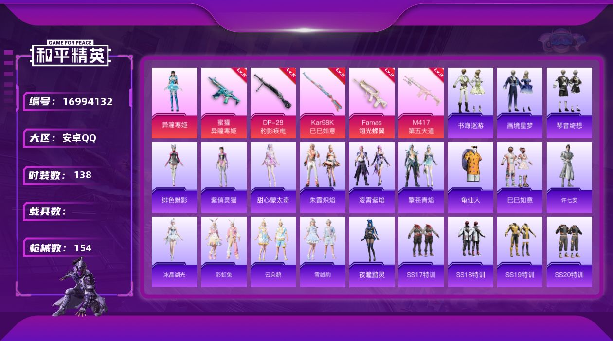 [16994132]安卓 手Q-1粉装-6特效枪-0载具-1粉色飞行器-43271热力值-8王牌印记-138套装-154枪皮