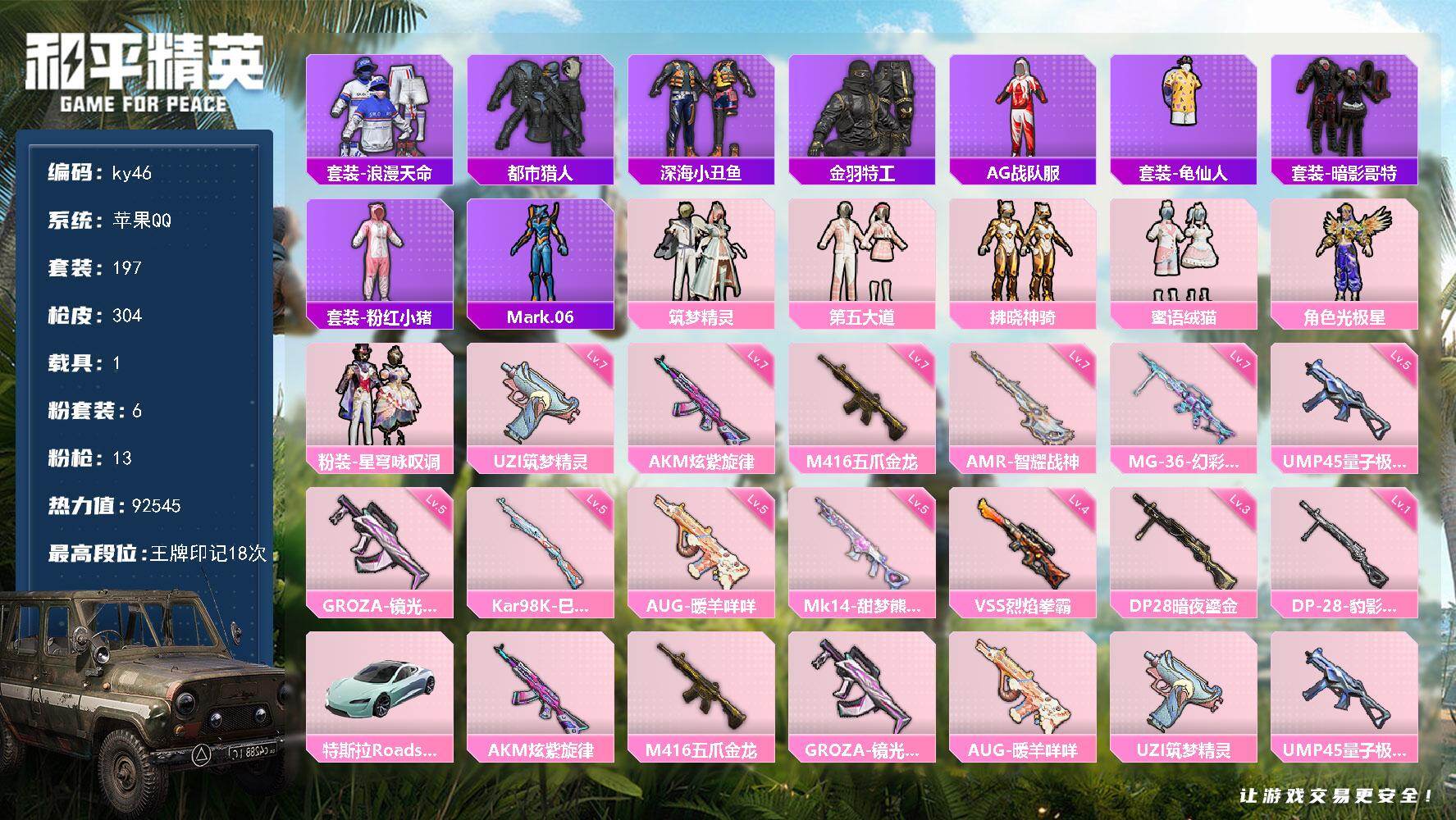[16994260]苹果 手Q-6粉装-13特效枪-1载具-7粉色飞行器-92545热力值-18王牌印记-197套装-304枪皮 【热门品类】:套装-浪漫天命,套装-都市猎人,套装-深海小丑鱼,套装-金羽特工,套装-AG战队服,套装-龟仙人,套装-暗影哥特,套装-粉红小猪,角色-Mark.06 【粉色套装】:粉装-筑梦精灵,粉装-第五大道,粉装-拂晓神骑,粉装-蜜语绒猫,角色-光极星,粉装-星穹咏叹调 【粉色枪皮等级】:AKM-炫紫旋律(七级),M416-五爪金龙(七级),GROZA-镜光银凌(五级),AUG-暖羊咩咩(五级),UZI-筑梦精灵(七级),UMP45-量子极限(五级),Kar98K-巳巳如意(五级),VSS-烈焰拳霸(四级),Mk14-甜梦熊击(五级),AMR-智耀战神(七级),DP-28-暗夜鎏金(三级),DP-28-豹影疾电(一级),MG-36-幻彩电音(七级) 【粉色载具】:特斯拉Roadster(水滴蓝) 【粉色枪皮】:AKM-炫紫旋律,M416-五爪金龙,GROZA-镜光银凌,AUG-暖羊咩咩,UZI-筑梦精灵,UMP45-量子极限,Kar98K-巳巳如意,VSS-烈焰拳霸,Mk14-甜梦熊击,AMR-智耀战神,DP-28-暗夜鎏金,DP-28-豹影疾电,MG-36-幻彩电音 【粉色飞行器】:梦幻火箭飞行器,拂晓神骑飞行器,镜光幻境飞行翼,冠军兔兔飞行器,脆鲨七海飞行器,动力核心飞行器 【粉色降落伞】:梦幻火箭降落伞,甜梦小狐降落伞,环太平洋降落伞,彩虹甜喵降落伞,旋转彩虹降落伞,炫光之旅降落伞,幻彩电音降落伞,炫彩糖果降落伞 【稀有套装】:套装-龟仙人,套装-巳巳如意,套装-雪国风尚,套装-炫彩糖果,套装-雏菊兔兔,套装-萝兰蝴蝶,角色-拉斐尔,套装-糖糖葫芦,套装-青团波波,角色-都市丽猫,角色-摩登魅猫,套装-燕燕于飞,套装-鱼渊荷华,角色-海琴烟,套装-紫幽梦,套装-蓝冰羽,套装-云朵鹅,套装-雪绒豹,套装-朱霞炽焰,套装-凌霄紫焰,角色-绯色魅影,套装-书海巡游,套装-画境星梦,套装-琴音绮想 【稀有枪皮】:AUG-冰晶雪宝,AKM-夜灯,AKM-彩虹符号,AKM-影袭,AKM-星之彼岸,AKM-春暖花开,AKM-灼热熔岩,AKM-生命誓言,AKM-胡桃卫兵,AKM-萌趣颜团子,AKM-虎虎生威,AKM-霓虹街区,AKM-龙的传人,M16A4-幻世战