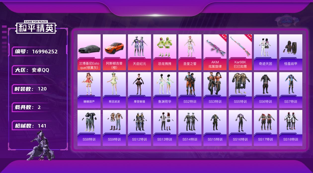 [16996252]【店主推荐捡漏号!可直接换绑】 安卓 手Q-3粉装-2特效枪-2载具-0粉色飞行器-45154热力值-5王牌印记-120套装-141枪皮 【粉色套装】:粉装-天启纪元,粉装-恐龙拽拽,角色-圣堂之誓 【粉色枪皮等级】:AKM-炫紫旋律(七级),Kar98K-巳巳如意(一级) 【粉色载具】:兰博基尼Estoque(银翼灰),阿斯顿马丁DBX(橙) 【粉色枪皮】:AKM-炫紫旋律,Kar98K-巳巳如意 【粉色降落伞】:暗夜玫瑰降落伞,碧影闪光降落伞 【稀有套装】:套装-糖糖葫芦,套装-青团波波,角色-摩登魅猫,套装-鱼渊荷华 【稀有枪皮】:AKM-冰凉西瓜,AKM-夜灯,AKM-星之彼岸,AKM-灼热熔岩,AKM-生命誓言,AKM-破晓战魂,AKM-萌趣颜团子,AKM-虎虎生威,AKM-霓虹街区,M16A4-九霄,M16A4-夜灯,M16A4-幻世战舞者,M16A4-红色方程式,M16A4-蓝色火焰,SCAR-L-炫彩节奏,SCAR-L-红色方程式,M416-仓鼠灰灰,M416-夜灯,M416-糯团青竹,M416-红色方程式,M416-蓝色火焰,GROZA-彩虹符号,GROZA-春暖花开,GROZA-治愈之星,AUG-耀粉歌者,QBZ-彩虹符号,QBZ-神秘黑猫,QBZ-飞驰魅影,M762-天降萌叽,M762-拳皇97,M762-牛气冲天,M762-瑞龙福将,M762-绯红前夜,M762-镭射皇者,AC-VAL-天降萌叽,AC-VAL-快闪甜心,UZI-众神之王,UZI-啾咪啾咪,UZI-炫彩节奏,UZI-生命誓言,UZI-红色方程式,UMP45-夜灯,UMP45-天启纪元,UMP45-春暖花开,UMP45-蓝色火焰,Vector-彩虹符号,Vector-暗夜玫瑰,Vector-治愈之星,Vector-生命誓言,汤姆逊-勇闯险境,汤姆逊-耀粉歌者,野牛-青春冒险家,MP5K-众神之王,P90-快闪甜心,P90-飞驰魅影,Kar98K-勇闯险境,Kar98K-古堡领主,Kar98K-彩虹符号,Kar98K-红色方程式,Kar98K-终极赛罗,Kar98K-飞驰魅影,M24-治愈之星,M24-众神之王,SKS-勇闯险境,SKS-夜灯,SKS-玉龙,SKS-糯团青竹,VSS-华贵君王,Mini14-耀粉歌者,Mini14-金鼠迎春,Mk14-山经魅狐,Mk14-治愈之星,