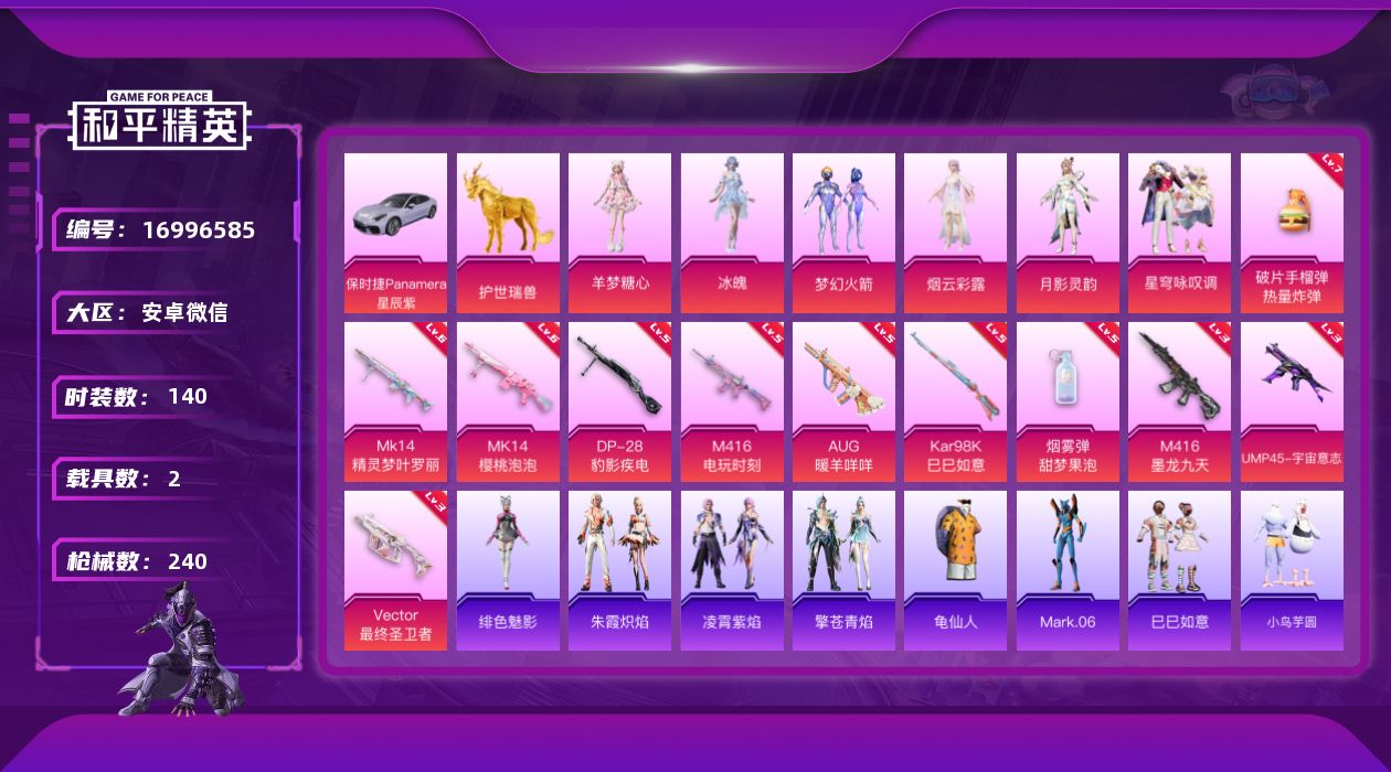 [16996585]【特价出售/店主推荐】安卓 微信-6粉装-11特效枪-2载具-11粉色飞行器-8.2w热力值-15王牌印记-140套装-240枪皮 【热门品类】:粉装-梦幻火箭,套装-龟仙人,角色-Mark.06 【粉色套装】:粉装-梦幻火箭,角色-烟云彩露,角色-月影灵韵,粉装-星穹咏叹调,角色-冰魄,角色-羊梦糖心 【粉色枪皮等级】:M416-电玩时刻(五级),M416-墨龙九天(三级),AUG-暖羊咩咩(五级),UMP45-宇宙意志(三级),Vector-最终圣卫者(三级),Kar98K-巳巳如意(五级),Mk14-精灵梦叶罗丽(六级),Mk14-樱桃泡泡(六级),DP-28-豹影疾电(五级),烟雾弹-甜梦果泡(五级),破片手榴弹-热量炸弹(七级) 【粉色载具】:保时捷Panamera(星辰紫),护世瑞兽 【粉色枪皮】:M416-电玩时刻,M416-墨龙九天,AUG-暖羊咩咩,UMP45-宇宙意志,Vector-最终圣卫者,Kar98K-巳巳如意,Mk14-精灵梦叶罗丽,Mk14-樱桃泡泡,DP-28-豹影疾电,烟雾弹-甜梦果泡,破片手榴弹-热量炸弹 【粉色飞行器】:梦幻火箭飞行器,星之彼岸飞行器,天之羽翼飞行器,沙丘之主天马,镜域双华-灵镜之阶,龙翔九天飞行器,幻海精灵飞行器,雀灵庇佑飞行器,灵珠游龙飞行器,极意拳锋飞行器 【粉色降落伞】:梦幻火箭降落伞,洛神天依降落伞,庄周梦蝶降落伞,星夜魔法师降落伞,垂柳戏鸭降落伞,歌者泠鸢降落伞,镜域双华降落伞,江南烟雨降落伞,精灵梦叶罗丽降落伞,墨龙九天降落伞,金丰海韵降落伞,拳皇·狂花道降落伞,幽焰骑士降落伞,千金淑猫降落伞,辉羽雀灵降落伞,绯穹魔姬降落伞,极意拳锋降落伞,炫彩糖果降落伞 【稀有套装】:套装-龟仙人,套装-巳巳如意,套装-小鸟芋圆,套装-糖糖葫芦,套装-青团波波,角色-光矢逐梦,套装-燕燕于飞,套装-鱼渊荷华,套装-晶辉守护,角色-蜜桃派对,套装-粉恋花,套装-紫幽梦,套装-蓝冰羽,套装-星渊小夜曲,套装-极速光影,套装-彩虹兔,套装-云朵鹅,套装-雪绒豹,角色-乐音,套装-蓝海鲸歌,角色-夜瞳黯灵,套装-朱霞炽焰,套装-凌霄紫焰,套装-擎苍青焰,角色-绯色魅影,套装-炫彩糖果 【稀有枪皮】:AUG-冰晶雪宝,AKM-生命誓言,AKM-破晓战魂,AKM-霓虹街区,AKM-龙的传人,M16A4-幻世战舞者,M16A
