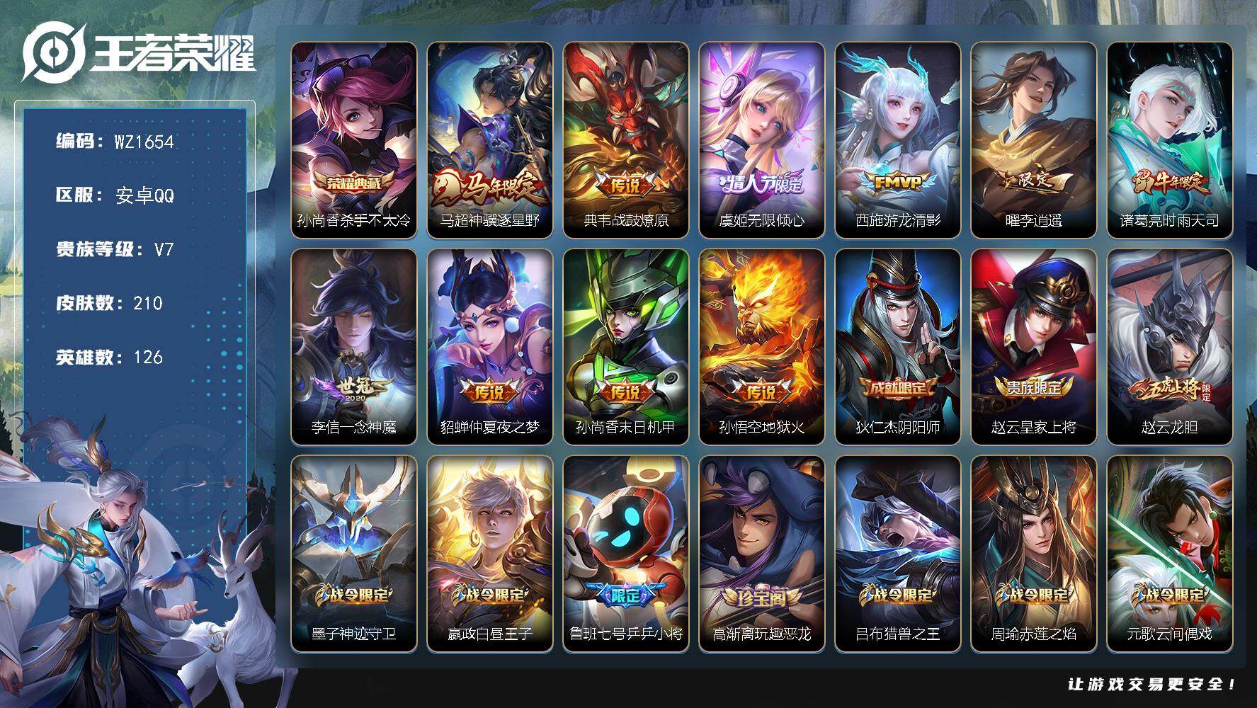 [16996722]安卓Q-V7-至尊星耀IV段位-126英雄-210皮肤-1典藏皮肤-10传说-56史诗 【荣耀典藏】:孙尚香杀手不太冷 【传说皮肤】:马超神骥逐星野,典韦战鼓燎原,虞姬无限倾心,西施游龙清影,曜李逍遥 ,诸葛亮时雨天司,李信一念神魔,貂蝉仲夏夜之梦,孙尚香末日机甲,孙悟空地狱火 【限定皮肤】:狄仁杰阴阳师,赵云皇家上将,赵云龙胆,墨子神迹守卫,嬴政白昼王子,鲁班七号乒乒小将,高渐离玩趣恶龙,吕布猎兽之王,周瑜赤莲之焰,元歌云间偶戏,夏侯惇朔风刀,马可波罗暗影游猎,狄仁杰魔术师,狄仁杰万华元夜,达摩星际陆战队,达摩沙漠行僧,项羽海滩派对,老夫子醍醐杖,老夫子航海奇遇记,程咬金演武夺筹,韩信逐梦之影,兰陵王驯魔猎人,兰陵王金庭之子,花木兰青春决赛季,亚瑟潮玩骑士王,孙悟空至尊宝,牛魔御旌,李元芳云中旅人,虞姬霸王别姬,虞姬无限倾心,钟馗驱傩正仪,干将莫邪冰霜恋舞曲,雅典娜黎明之约,蔡文姬繁星吟游,鬼谷子原初探秘者,鬼谷子五谷丰年,诸葛亮时雨天司,大乔白鹤梁神女,苏烈千军破阵,百里玄策原初追逐者,弈星混沌棋,沈梦溪大漠名商,明世隐疑决卦,裴擒虎李小龙,裴擒虎擒涛扼浪,米莱狄御霄,米莱狄胡桃异想国,云中君纤云弄巧,伽罗天狼溯光者,盾山御銮,猪八戒西部大镖客,上官婉儿梁祝,曜李逍遥 ,鲁班大师探海日志,镜匿光追影者,桑启海盐诗旅,艾琳女武神,阿古朵江河有灵,张良古海寻踪,鬼谷子天穹祈灯,沈梦溪龙舞盛年 【年限皮肤】:诸葛亮时雨天司 【赛季限定】:米莱狄御霄,牛魔御旌,盾山御銮,夏侯惇朔风刀,弈星混沌棋,明世隐疑决卦,老夫子醍醐杖,鬼谷子原初探秘者,狄仁杰万华元夜,程咬金演武夺筹,钟馗驱傩正仪,苏烈千军破阵,达摩沙漠行僧,兰陵王金庭之子,沈梦溪大漠名商,李元芳云中旅人,桑启海盐诗旅,裴擒虎擒涛扼浪,鲁班大师探海日志,张良古海寻踪,鬼谷子天穹祈灯,百里玄策原初追逐者,雅典娜黎明之约 【战令限定】:嬴政白昼王子,吕布猎兽之王,兰陵王驯魔猎人,周瑜赤莲之焰,马可波罗暗影游猎,猪八戒西部大镖客,元歌云间偶戏,亚瑟潮玩骑士王,米莱狄胡桃异想国,达摩星际陆战队,老夫子航海奇遇记,墨子神迹守卫,周瑜线条小狗 【史诗皮肤】:鲁班七号电玩小子,赵云皇家上将,赵云未来纪元,甄姬冰雪圆舞曲,狄仁杰魔术师,廉颇地狱岩魂,宫本武藏鬼剑武藏,孙尚香水果甜心,妲己魅力维加斯,妲己女仆咖啡,墨子金属风暴,吕