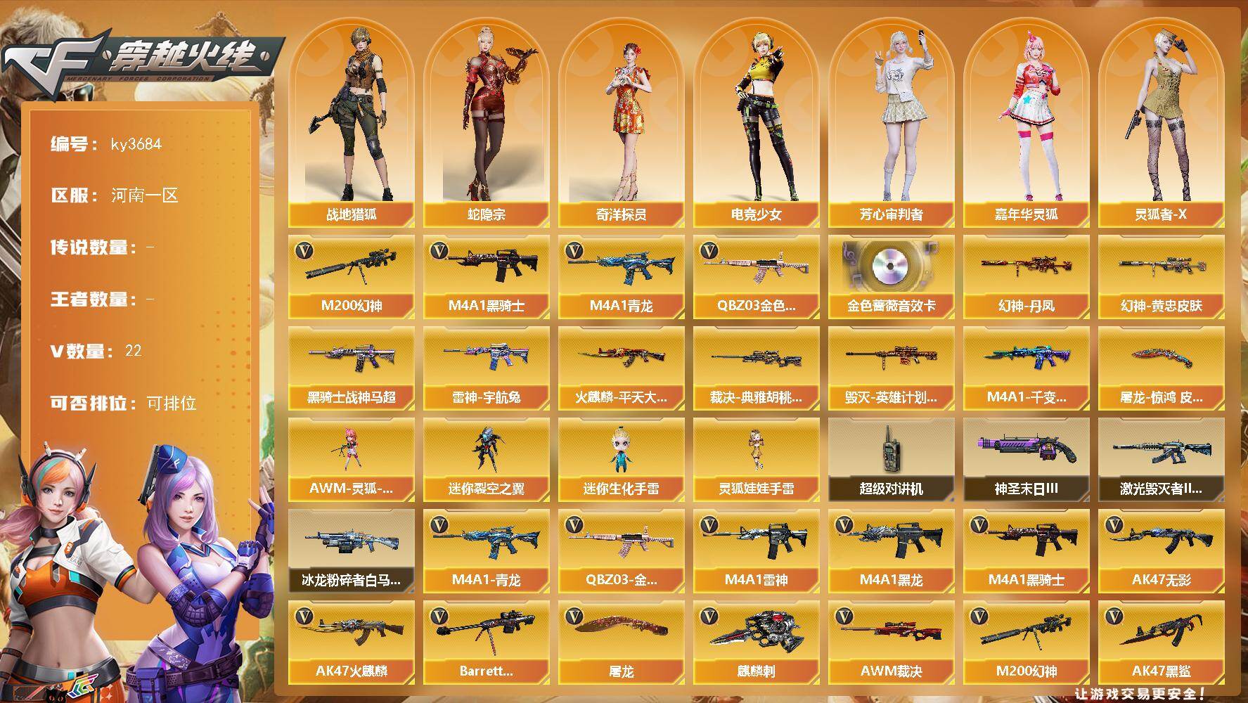 [16996997]河南一区-22V-0王者-0炫金 【热门武器】:QBZ03-金色蔷薇,M4A1-青龙,M200-幻神,M4A1-黑骑士 【音效卡】:QBZ03-金色蔷薇音效卡 【皮肤】:M200-幻神-黄忠皮肤,幻神-丹凤,裁决-典雅胡桃 皮肤,雷神-宇航兔皮肤,火麒麟-平天大圣,毁灭-英雄计划 皮肤,M4A1-千变-孔明皮肤,黑骑士-战神马超,屠龙-惊鸿 皮肤 【角色】:战地猎狐,蛇隐宗,奇洋探员,电竞少女,芳心审判者,嘉年华灵狐,0号玩家,灵狐者-X,潘多拉-甜心教官,蛇姬,兔囡囡,维纳斯,新娜塔莎,智影 【人偶武器】:AWM-灵狐-15周年嘉年华,迷你裂空之翼,迷你生化手雷,灵狐娃娃手雷 【暴走生化】:超级对讲机 【挑战大师】:冰龙粉碎者-白马银枪,激光毁灭者III-白马银枪,神圣爆裂者-末日III 【英雄级武器】:AK47-火麒麟,M4A1-黑龙,M4A1-雷神,M4A1-黑骑士,AK47-无影,AK47-黑鲨,M4A1-青龙,无影-神兵利器,黑武士-锦绣游龙,QBZ03-金色蔷薇,Barrett-毁灭,AWM-裁决,M200-幻神,屠龙,麒麟刺,擎天-竞技荣光,高爆手雷-竞技荣光,手雷-热带奇洋,高爆手雷-玄豹,闪光弹-玄豹,烟雾弹-古蛇迷踪,烟雾弹-玄豹,M4A1-赤狱骑士 【道具】:CFS限定背包,亚洲杯纪念炫彩背包,虎牙炫彩背包,超级背包,女皇终结者-魔龙之吻,救世主-黑桃战神,绿色巨人,灵魂忍者*2,迷雾幽灵,生化弹匣,夺命之镰,防化服*3,金色流光-枪王排位*2,星辰流光-枪王排位,枪王排位28赛季金色流光,枪王排位29赛季金色流光,斯沃特表情,循环实验表情,C4-红龙,防弹头盔*5,防弹衣*5,C4工具钳*5,手雷包*5 【特殊枪械】:1黑骑士