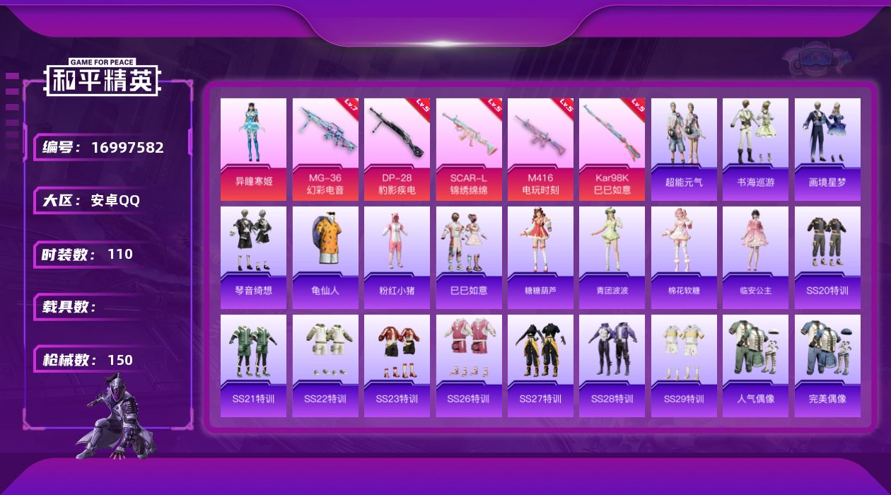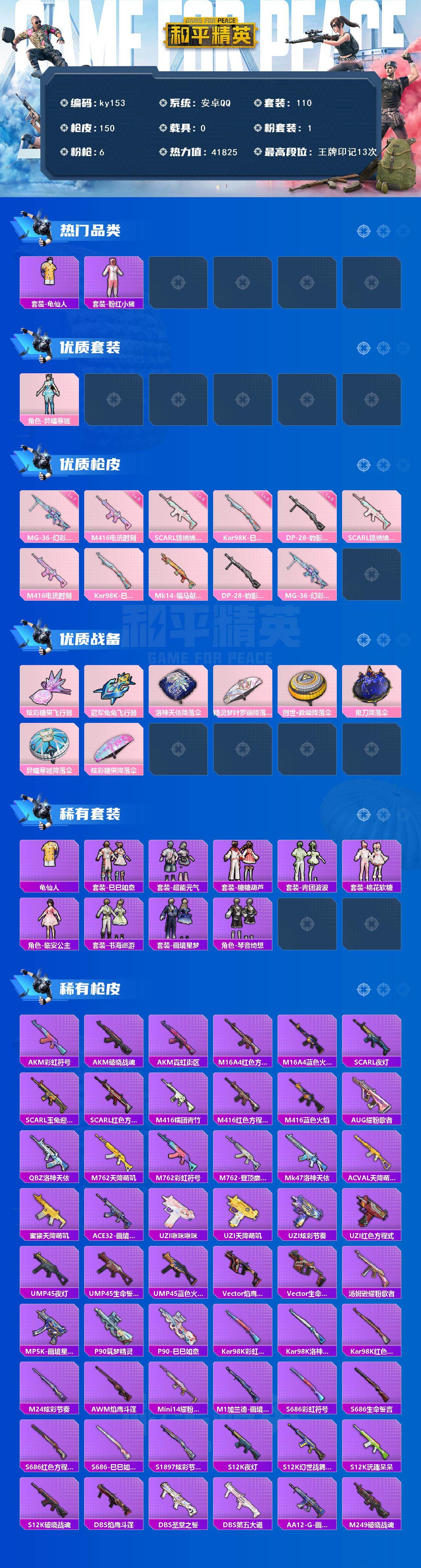 [16997582]安卓 手Q-1粉装-6特效枪-0载具-3粉色飞行器-41825热力值-13王牌印记-110套装-150枪皮 【热门品类】:套装-龟仙人,套装-粉红小猪 【粉色套装】:角色-异瞳寒姬 【粉色枪皮等级】:SCAR-L-锦绣绵绵(五级),M416-电玩时刻(五级),Kar98K-巳巳如意(五级),DP-28-豹影疾电(五级),MG-36-幻彩电音(七级) 【粉色枪皮】:SCAR-L-锦绣绵绵,M416-电玩时刻,Kar98K-巳巳如意,Mk14-福马献瑞,DP-28-豹影疾电,MG-36-幻彩电音 【粉色飞行器】:炫彩糖果飞行器,冠军兔兔飞行器 【粉色降落伞】:洛神天依降落伞,精灵梦叶罗丽降落伞,创世·救赎降落伞,鬼刀降落伞,异瞳寒姬降落伞,炫彩糖果降落伞 【稀有套装】:套装-龟仙人,套装-巳巳如意,套装-超能元气,套装-雪国风尚,套装-炫彩糖果,套装-糖糖葫芦,套装-青团波波,套装-棉花软糖,角色-临安公主,套装-书海巡游,套装-画境星梦,套装-琴音绮想 【稀有枪皮】:AUG-冰晶雪宝,AKM-彩虹符号,AKM-破晓战魂,AKM-霓虹街区,M16A4-红色方程式,M16A4-蓝色火焰,SCAR-L-夜灯,SCAR-L-玉兔迎春,SCAR-L-红色方程式,M416-糯团青竹,M416-红色方程式,M416-蓝色火焰,AUG-耀粉歌者,QBZ-洛神天依,M762-天降萌叽,M762-彩虹符号,M762-登顶巅峰,Mk47-洛神天依,AC-VAL-天降萌叽,蜜獾-天降萌叽,ACE32-画境星梦,UZI-啾咪啾咪,UZI-天降萌叽,UZI-炫彩节奏,UZI-红色方程式,UMP45-夜灯,UMP45-生命誓言,UMP45-蓝色火焰,Vector-焰鹰斗篷,Vector-生命誓言,汤姆逊-耀粉歌者,MP5K-画境星梦,P90-筑梦精灵,P90-巳巳如意,Kar98K-彩虹符号,Kar98K-洛神天依,Kar98K-红色方程式,M24-炫彩节奏,AWM-焰鹰斗篷,Mini14-耀粉歌者,M1加兰德-画境星梦,S686-彩虹符号,S686-生命誓言,S686-红色方程式,S686-巳巳如意,S1897-炫彩节奏,S12K-玩趣呆呆,S12K-破晓战魂,S12K-夜灯,S12K-幻世战舞者,DBS-焰鹰斗篷,DBS-圣堂之誓,DBS-第五大道,AA12-G-画境星梦,M249-破晓战魂