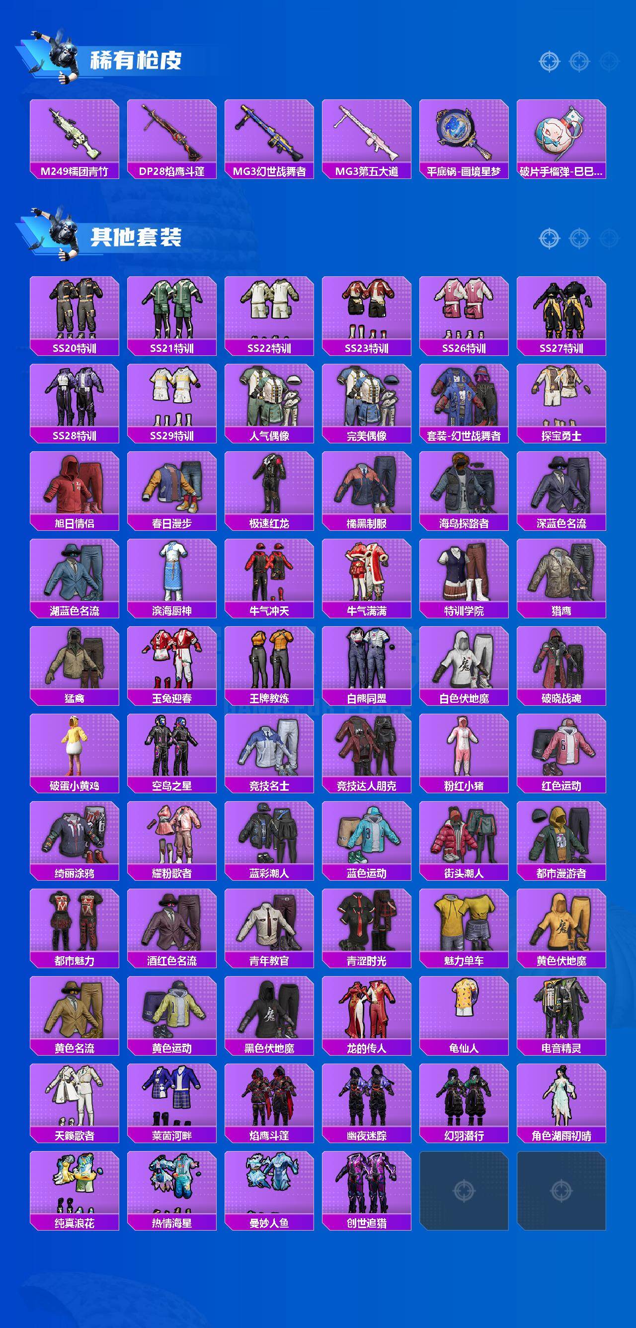 【稀有枪皮】:AUG-冰晶雪宝,AKM-彩虹符号,AKM-破晓战魂,AKM-霓虹街区,M16A4-红色方程式,M16A4-蓝色火焰,SCAR-L-夜灯,SCAR-L-玉兔迎春,SCAR-L-红色方程式,M416-糯团青竹,M416-红色方程式,M416-蓝色火焰,AUG-耀粉歌者,QBZ-洛神天依,M762-天降萌叽,M762-彩虹符号,M762-登顶巅峰,Mk47-洛神天依,AC-VAL-天降萌叽,蜜獾-天降萌叽,ACE32-画境星梦,UZI-啾咪啾咪,UZI-天降萌叽,UZI-炫彩节奏,UZI-红色方程式,UMP45-夜灯,UMP45-生命誓言,UMP45-蓝色火焰,Vector-焰鹰斗篷,Vector-生命誓言,汤姆逊-耀粉歌者,MP5K-画境星梦,P90-筑梦精灵,P90-巳巳如意,Kar98K-彩虹符号,Kar98K-洛神天依,Kar98K-红色方程式,M24-炫彩节奏,AWM-焰鹰斗篷,Mini14-耀粉歌者,M1加兰德-画境星梦,S686-彩虹符号,S686-生命誓言,S686-红色方程式,S686-巳巳如意,S1897-炫彩节奏,S12K-玩趣呆呆,S12K-破晓战魂,S12K-夜灯,S12K-幻世战舞者,DBS-焰鹰斗篷,DBS-圣堂之誓,DBS-第五大道,AA12-G-画境星梦,M249-破晓战魂