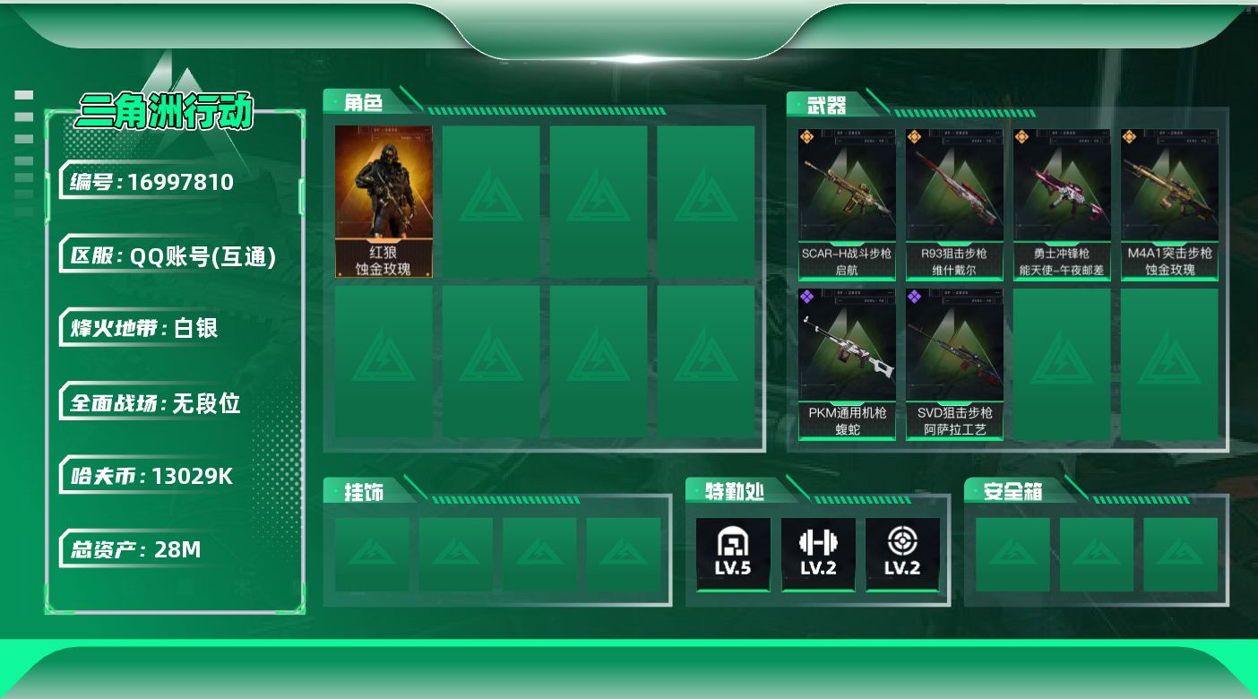 [16997810]【特价出售/店主推荐】28m总资产-13029k哈伏币-27烽火等级-白银-1战场等级-无军衔 【干员外观】:红狼-蚀金玫瑰 【近战皮肤】:近战-黑鹰 【传说外观】:M4A1突击步枪-蚀金玫瑰,SCAR-H战斗步枪-启航,勇士冲锋枪-能天使-午夜邮差,R93狙击步枪-维什戴尔 【史诗外观】:PKM通用机枪-蝮蛇,SVD狙击步枪-阿萨拉工艺 【稀有外观】:M4A1突击步枪-零点,K416突击步枪-碳纤维,M7战斗步枪-捣蛋鬼,AK-12突击步枪-零点,SCAR-H战斗步枪-荣耀列队,腾龙突击步枪-冰天雪地,K437突击步枪-生存指令,MK47突击步枪-精英联盟,MP5冲锋枪-哈夫克卫队,UZI冲锋枪-亚特兰蒂斯,SMG-45-行动开启,SMG-45冲锋枪-幻影结构,勇士冲锋枪-冰天雪地,M1014霰弹枪-幻影结构,QJB201轻机枪-哈夫克卫队,Mini-14射手步枪-荣耀列队,SVD狙击步枪-战术行动,SV-98狙击步枪-星链科技,SV-98狙击步枪-哈夫克航天,SV-98狙击步枪-精英联盟,G18-星链科技,G18-哈夫克航天 【普通外观】:M4A1突击步枪-粉色涂装,M4A1突击步枪-高雅黑,M4A1突击步枪-海色,QBZ95-1突击步枪-海浪,QBZ95-1突击步枪-海色,K416突击步枪-高雅黑,M16A4突击步枪-高雅黑,AUG突击步枪-浅蓝涂装,SG552突击步枪-海浪,SCAR-H战斗步枪-数码迷彩,G3战斗步枪-高雅黑,PTR-32突击步枪-黄蜂,MP5冲锋枪-黄蜂,Vector冲锋枪-几何迷彩,UZI冲锋枪-海色,M1014霰弹枪-海浪,M249轻机枪-黄蜂,M250通用机枪-条纹,SVD狙击步枪-高雅黑,SV-98狙击步枪-红色涂装,沙漠之鹰-海浪,沙漠之鹰-高雅黑 【载具外观】:轮式突击炮-荣耀 【挂饰】:挂饰-维什戴尔,挂饰-蚀金玫瑰,挂饰-诡影狙击兵,挂饰-崩岩重炮*3,挂饰-暗行哨兵*6,挂饰-启程,挂饰-紧急会议*10,挂饰-紧急撤离*12