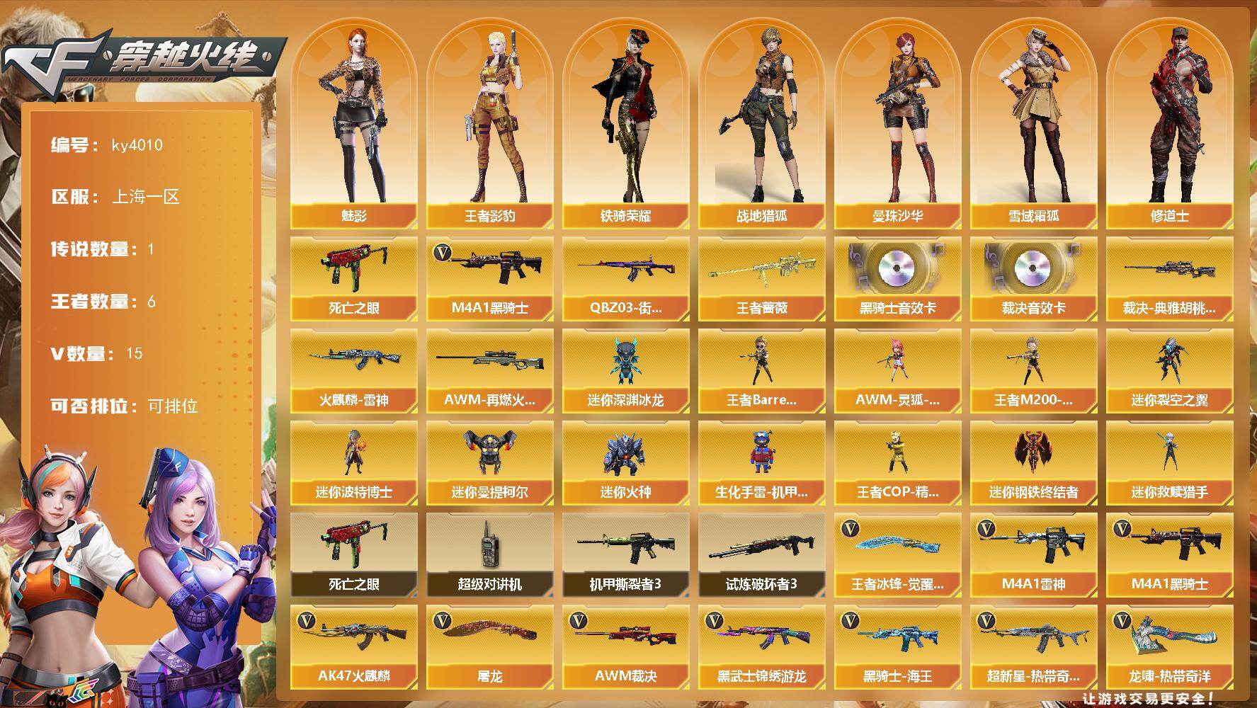 [16997821]上海一区-15V-6王者-0炫金 【传说角色】:传说星骇 【热门武器】:死亡之眼,QBZ03-街机,M4A1-黑骑士*5 【王者炫金武器】:王者蔷薇 【音效卡】:M4A1-黑骑士音效卡,AWM-裁决音效卡 【皮肤】:裁决-典雅胡桃 皮肤,火麒麟-雷神,AWM-再燃火线 【角色】:魅影,曼珠沙华,战地猎狐,王者影豹,雪域霜狐,奇洋探员,修道士,云海玲珑,电竞少女,芳心审判者,飞虎队-X,娟娟,猎狐者-追月,0号玩家,灵狐者-X,玫瑰花神,潘多拉-X,潘多拉-甜心教官,潜龙队-X,铁骑荣耀,新娜塔莎,夜玫瑰-宠粉,游珑儿 【人偶武器】:王者Barrett-英勇金戈,王者M200-无畏金戈,王者COP-精英刀锋*2,迷你钢铁终结者,迷你救赎猎手*2,AWM-灵狐-15周年嘉年华*2,迷你深渊冰龙*6,迷你裂空之翼*2,迷你波特博士,迷你曼提柯尔,迷你火种,生化手雷-机甲核心 【暴走生化】:死亡之眼,超级对讲机 【挑战大师】:机甲撕裂者III,试炼破坏者III*2 【英雄级武器】:AK47-火麒麟,M4A1-雷神,M4A1-黑骑士*5,黑武士-锦绣游龙,超新星-热带奇洋,黑骑士-海王,AWM-裁决,屠龙,龙啸-热带奇洋,王者冰锋-觉醒版,手雷-热带奇洋,M4A1-赤狱骑士,AWM-昌龙 【道具】:CFS限定背包,云山科技背包,亚洲杯纪念炫彩背包,沙漠龙背包-猛男专属,热带奇洋炫彩背包,牛魔王背包-至尊黄金,超级背包,金狐背包,雪域霜狐炫彩背包,黄金魔花研究所背包,女皇终结者-魔龙之吻,救世主-黑桃战神,黄金生化钩,绿色巨人,灵魂忍者*2,迷雾幽灵*2,夺命之镰,防化服*3,星辰流光-枪王排位,流光-鎏金之域,流光-再燃火线,枪王排位28赛季金色流光,枪王排位29赛季金色流光,热带奇洋表情,炽雪表情,斯沃特表情,防弹头盔*3,防弹衣*3,C4工具钳*3,手雷包*3 【特殊枪械】:5黑骑士