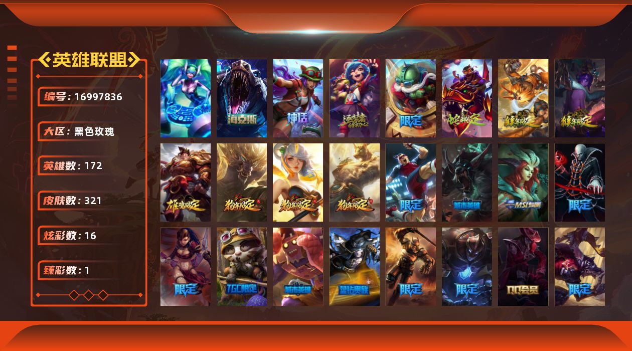 [16997836]【店主推荐捡漏号】青铜段位-172英雄-321皮肤-16炫彩-1终极-3神话-55限定-32传说-80史诗
