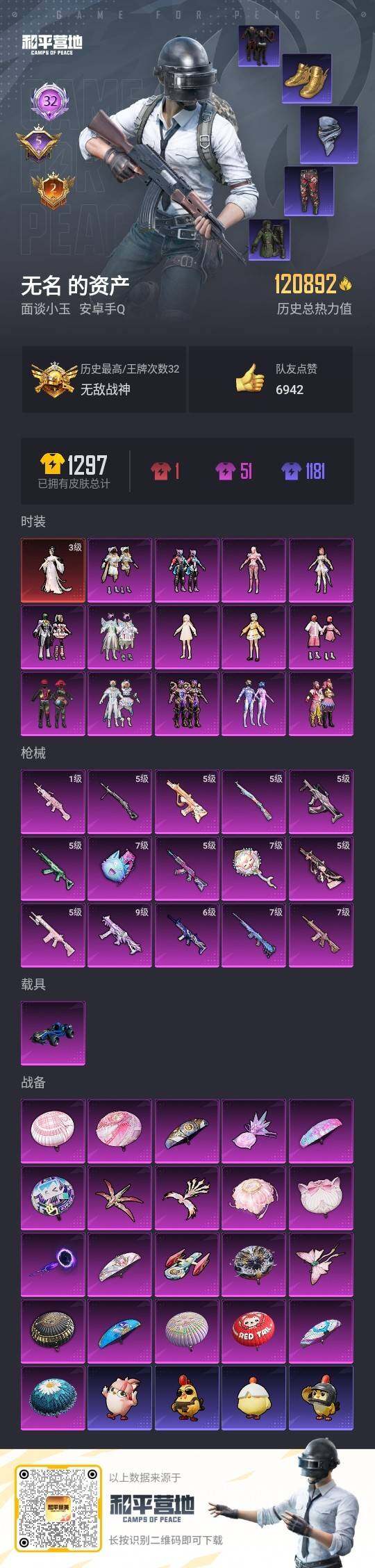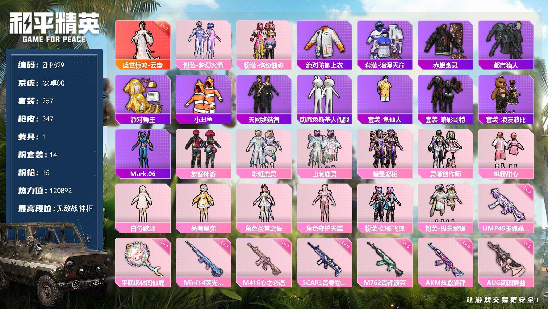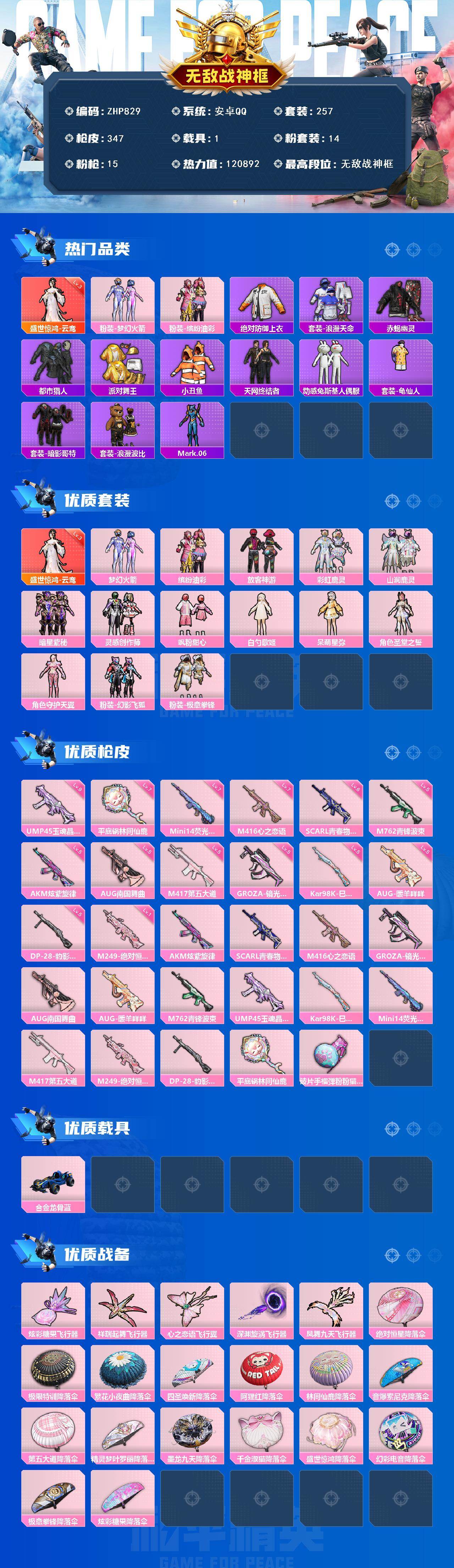 [16997881]安卓 手Q-无敌战神框-1神装-14粉装-15特效枪-1载具-6粉色飞行器-120892热力值-32王牌印记-257套装-347枪皮