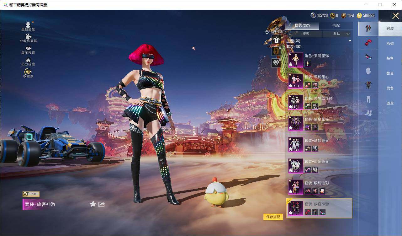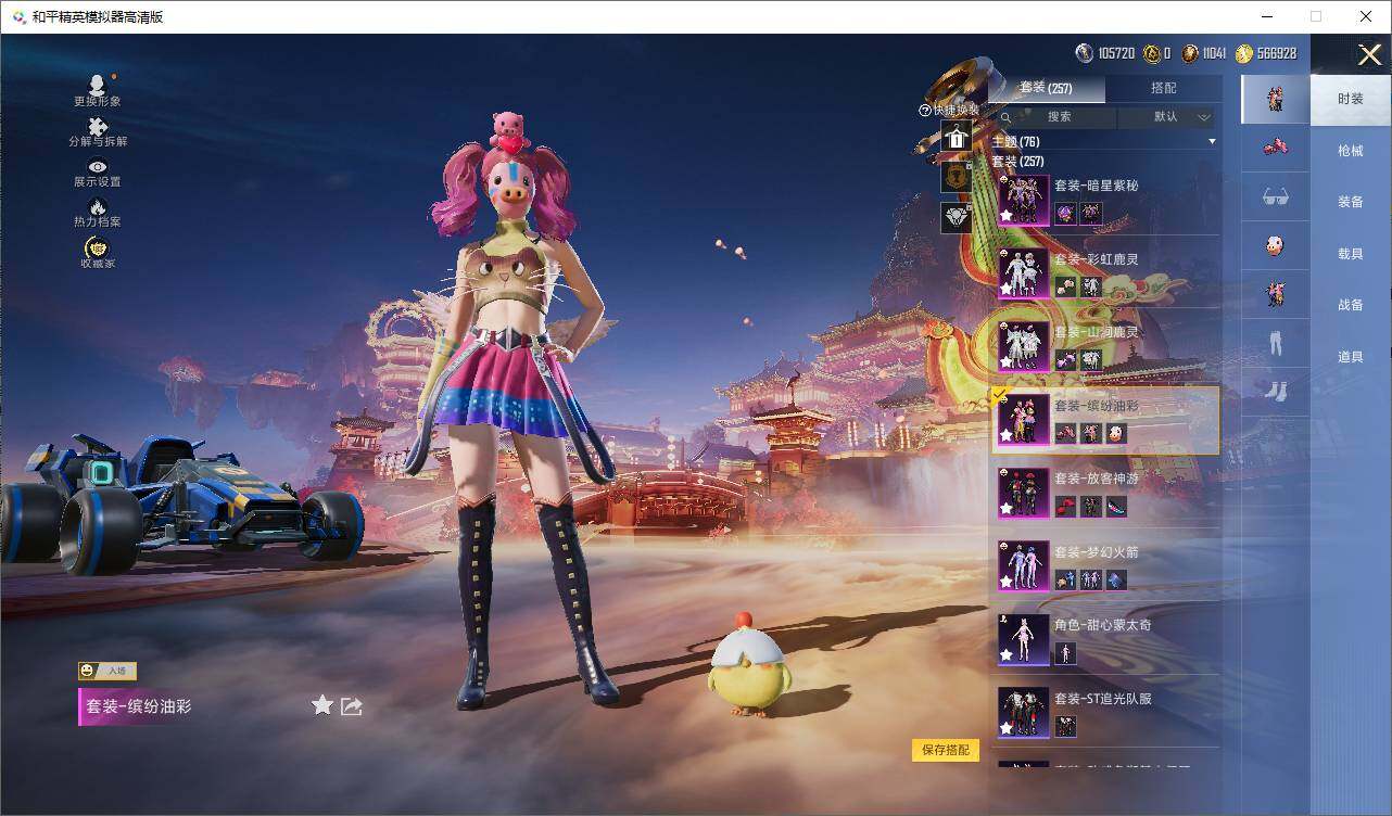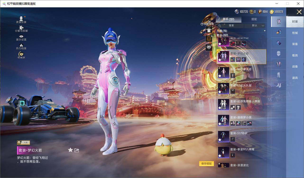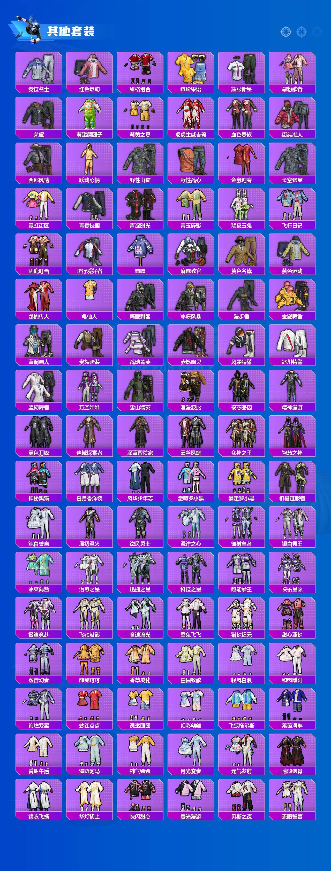 【粉色套装】:粉装-梦幻火箭,粉装-缤纷油彩,粉装-放客神游,粉装-彩虹鹿灵,粉装-山涧鹿灵,粉装-暗星紫秘,粉装-灵感创作师,粉装-飒粉甜心,角色-白勺歌姬,角色-呆萌星弥,角色-圣堂之誓,角色-守护天翼,粉装-幻影飞狐,粉装-极意拳锋