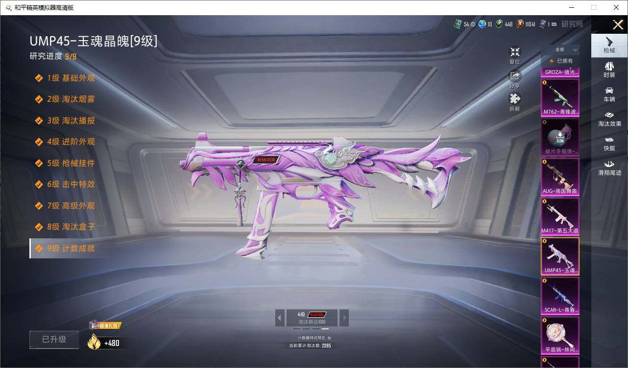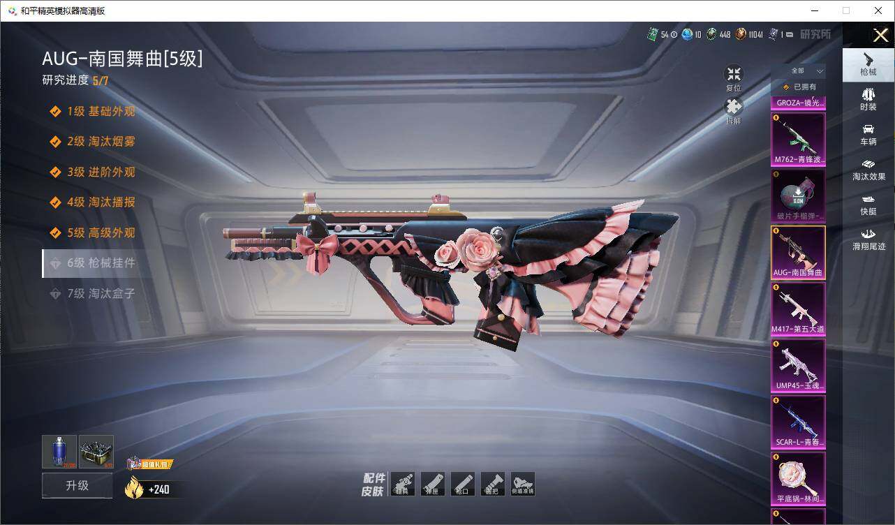 【粉色枪皮等级】:AKM-炫紫旋律(五级),SCAR-L-青春物语(六级),M416-心之恋语(七级),GROZA-镜光银凌(五级),AUG-南国舞曲(五级),AUG-暖羊咩咩(五级),M762-青锋波束(五级),UMP45-玉魂晶魄(九级),Kar98K-巳巳如意(五级),Mini14-荧光虫舞(七级),M417-第五大道(五级),M249-绝对恒星(一级),DP-28-豹影疾电(五级),平底锅-林间仙鹿(七级)