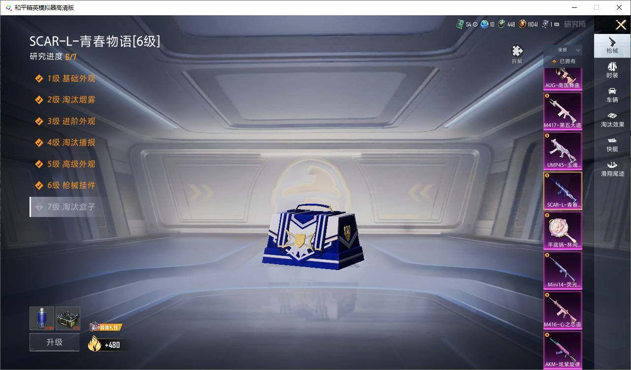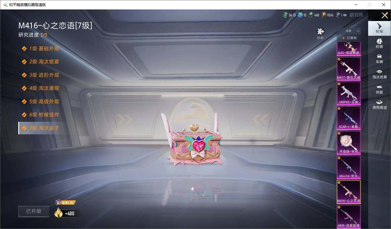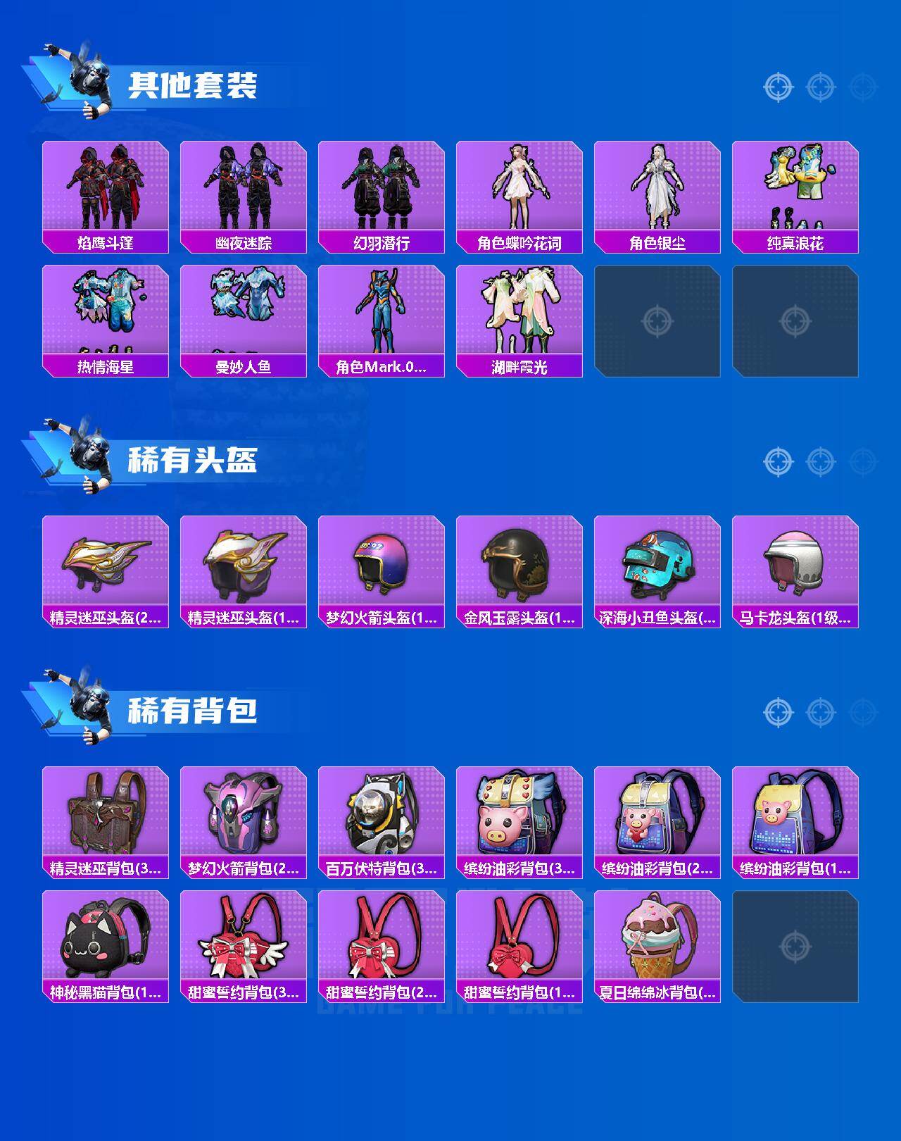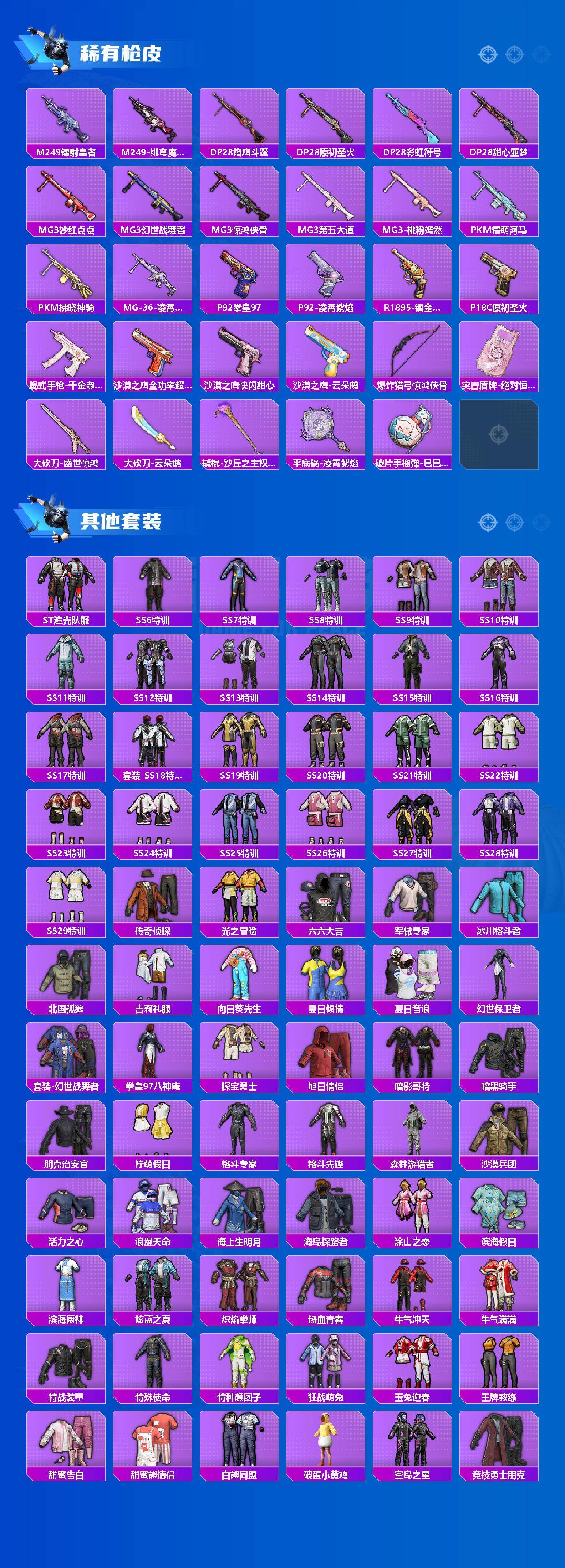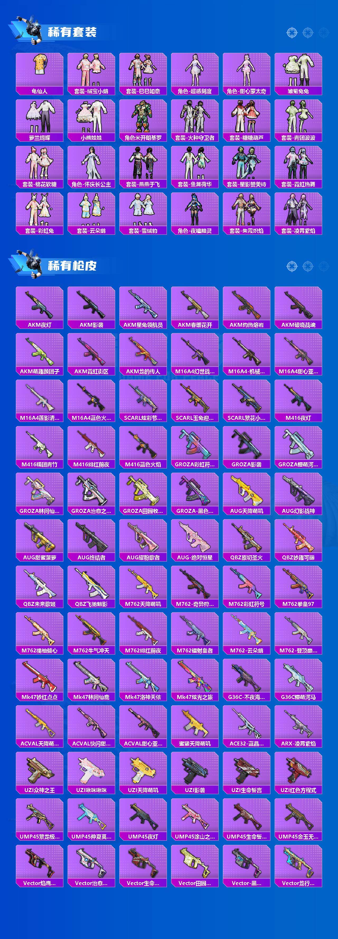 AKM-炫紫旋律,SCAR-L-青春物语,M416-心之恋语,GROZA-镜光银凌,AUG-南国舞曲,AUG-暖羊咩咩,M762-青锋波束,UMP45-玉魂晶魄,Kar98K-巳巳如意,Mini14-荧光虫舞,M417-第五大道,平底锅-林间仙鹿,破片手榴弹-粉粉猫爪