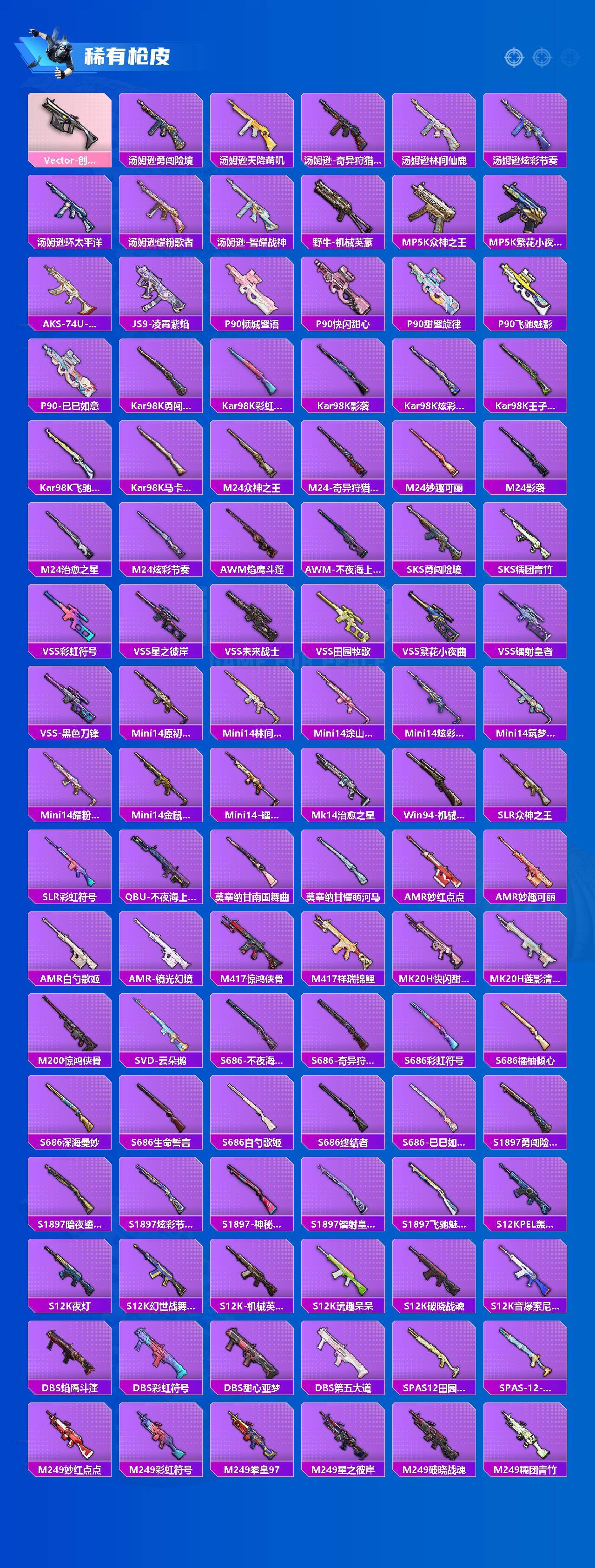 【粉色枪皮】:AKM-炫紫旋律,SCAR-L-青春物语,M416-心之恋语,GROZA-镜光银凌,AUG-南国舞曲,AUG-暖羊咩咩,M762-青锋波束,UMP45-玉魂晶魄,Kar98K-巳巳如意,Mini14-荧光虫舞,M417-第五大道,M249-绝对恒星,DP-28-豹影疾电,平底锅-林间仙鹿,破片手榴弹-粉粉猫爪