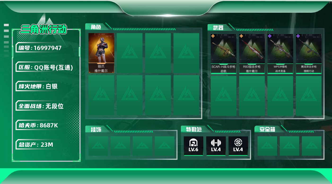 [16997947]可二次【特价出售/店主推荐】23m总资产-8687k哈伏币-41烽火等级-白银-1战场等级-无军衔 【干员外观】:骇爪-维什戴尔 【近战皮肤】:近战-黑鹰 【传说外观】:SCAR-H战斗步枪-启航,R93狙击步枪-维什戴尔 【史诗外观】:腾龙突击步枪-猎鳄行动,MP5冲锋枪-战术竞备 【稀有外观】:M7战斗步枪-捣蛋鬼,SCAR-H战斗步枪-荣耀列队,MP5冲锋枪-哈夫克卫队,P90冲锋枪-黄昏,P90冲锋枪-捣蛋鬼,SMG-45-行动开启,M1014霰弹枪-幻影结构,QJB201轻机枪-哈夫克卫队,Mini-14射手步枪-荣耀列队 【普通外观】:M4A1突击步枪-高雅黑,QBZ95-1突击步枪-高雅黑,QBZ95-1突击步枪-海浪,QBZ95-1突击步枪-海色,M16A4突击步枪-高雅黑,AUG突击步枪-浅蓝涂装,G3战斗步枪-高雅黑,PTR-32突击步枪-黄蜂,MP5冲锋枪-黄蜂,Vector冲锋枪-几何迷彩,野牛冲锋枪-高雅黑,M1014霰弹枪-高雅黑,M249轻机枪-黄蜂,M250通用机枪-条纹,SVD狙击步枪-高雅黑,QSZ92G-条纹,沙漠之鹰-海浪 【载具外观】:轮式突击炮-荣耀 【挂饰】:挂饰-羊角威龙,挂饰-维什戴尔,挂饰-诡影狙击兵,挂饰-启程,挂饰-紧急会议*8