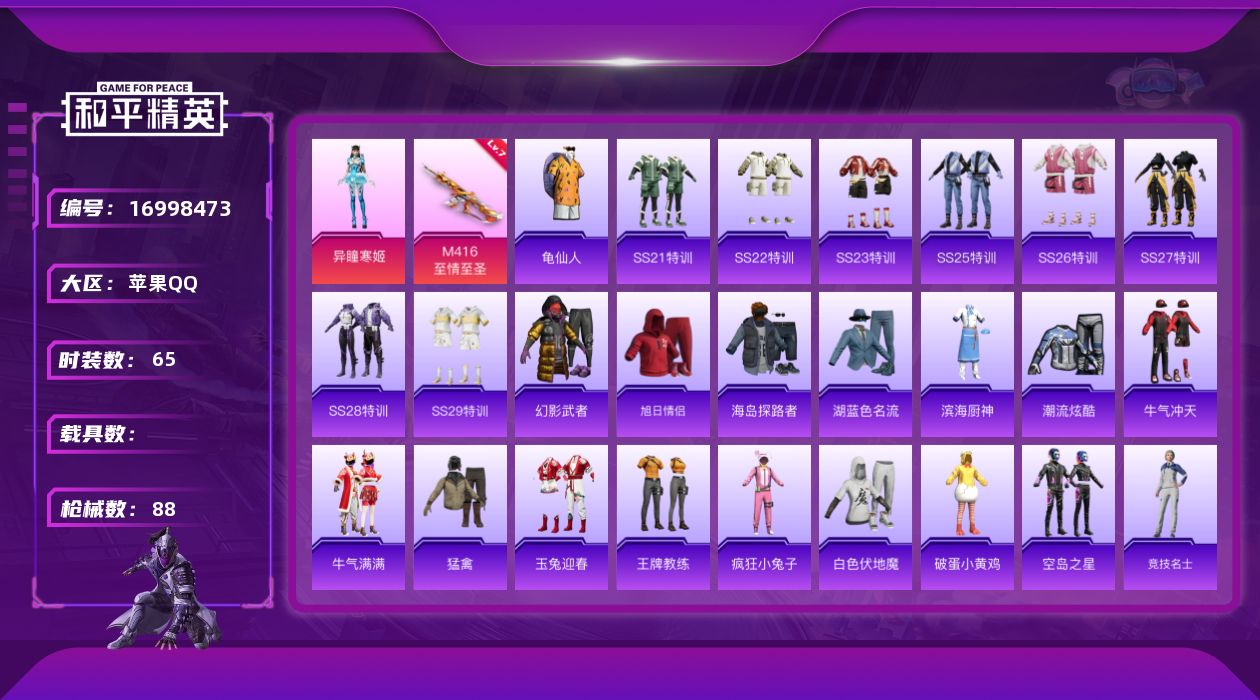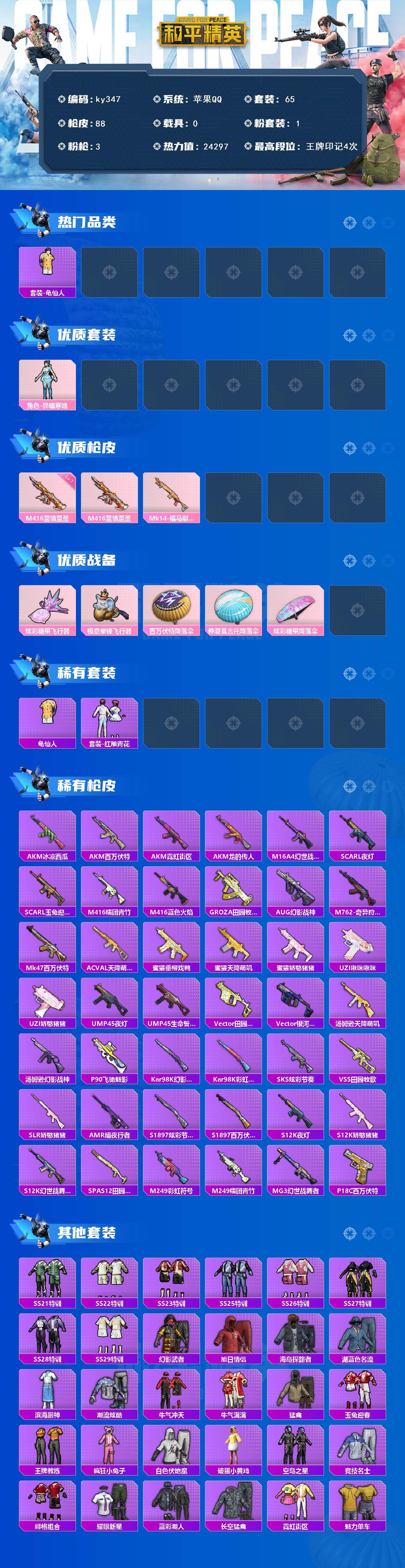 [16998473]苹果 手Q-1粉装-3特效枪-0载具-2粉色飞行器-24297热力值-4王牌印记-65套装-88枪皮 【热门品类】:套装-龟仙人 【粉色套装】:角色-异瞳寒姬 【粉色枪皮等级】:M416-至情至圣(七级) 【粉色枪皮】:M416-至情至圣,Mk14-福马献瑞 【粉色飞行器】:炫彩糖果飞行器,极意拳锋飞行器 【粉色降落伞】:百万伏特降落伞,仲夏莫吉托降落伞,炫彩糖果降落伞 【稀有套装】:套装-龟仙人,套装-炫彩糖果,套装-红釉青花 【稀有枪皮】:AUG-冰晶雪宝,AKM-冰凉西瓜,AKM-百万伏特,AKM-霓虹街区,AKM-龙的传人,M16A4-幻世战舞者,SCAR-L-夜灯,SCAR-L-玉兔迎春,M416-糯团青竹,M416-蓝色火焰,GROZA-田园牧歌,AUG-幻影战神,M762-奇异狩猎者,Mk47-百万伏特,AC-VAL-天降萌叽,蜜獾-垂柳戏鸭,蜜獾-天降萌叽,蜜獾-娇憨猪猪,UZI-啾咪啾咪,UZI-娇憨猪猪,UMP45-夜灯,UMP45-生命誓言,Vector-田园牧歌,Vector-银河战甲,汤姆逊-天降萌叽,汤姆逊-幻影战神,P90-飞驰魅影,Kar98K-幻影战神,Kar98K-彩虹符号,SKS-炫彩节奏,VSS-田园牧歌,SLR-娇憨猪猪,AMR-暗夜行者,S1897-炫彩节奏,S1897-百万伏特,S12K-夜灯,S12K-娇憨猪猪,S12K-幻世战舞者,SPAS-12-田园牧歌,M249-彩虹符号,M249-糯团青竹,MG3-幻世战舞者,P18C-百万伏特 【其他套装】:套装-SS21特训,套装-SS22特训,套装-SS23特训,套装-SS25特训,套装-SS26特训,套装-SS27特训,套装-SS28特训,套装-SS29特训,套装-幻影武者,套装-旭日情侣,套装-海岛探路者,套装-湖蓝色名流,套装-滨海厨神,套装-潮流炫酷,套装-牛气冲天,套装-牛气满满,套装-猛禽,套装-玉兔迎春,套装-王牌教练,套装-疯狂小兔子,套装-白色伏地魔,套装-破蛋小黄鸡,套装-空岛之星,套装-竞技名士,套装-绯格组合,套装-耀眼新星,套装-蓝彩潮人,套装-长空猛禽,套装-霓虹街区,套装-魅力单车,套装-麻辣教官,套装-黄色伏地魔,套装-黄色运动,套装-黑色伏地魔,套装-龙的传人,套装-龟仙人,套装-漫步者,套装-极地朋克,套装-冰川特警,套装-WiFi精