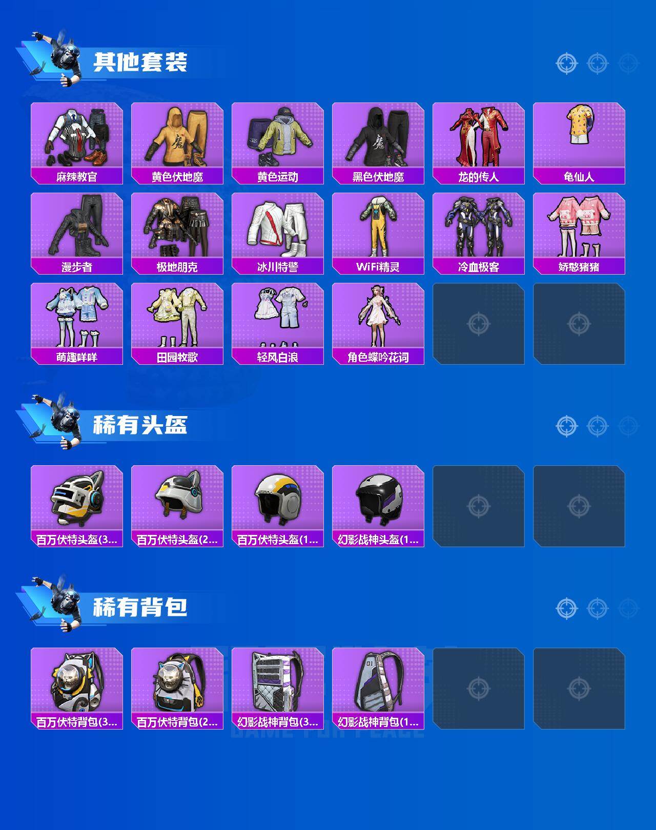 【其他套装】:套装-SS21特训,套装-SS22特训,套装-SS23特训,套装-SS25特训,套装-SS26特训,套装-SS27特训,套装-SS28特训,套装-SS29特训,套装-幻影武者,套装-旭日情侣,套装-海岛探路者,套装-湖蓝色名流,套装-滨海厨神,套装-潮流炫酷,套装-牛气冲天,套装-牛气满满,套装-猛禽,套装-玉兔迎春,套装-王牌教练,套装-疯狂小兔子,套装-白色伏地魔,套装-破蛋小黄鸡,套装-空岛之星,套装-竞技名士,套装-绯格组合,套装-耀眼新星,套装-蓝彩潮人,套装-长空猛禽,套装-霓虹街区,套装-魅力单车,套装-麻辣教官,套装-黄色伏地魔,套装-黄色运动,套装-黑色伏地魔,套装-龙的传人,套装-龟仙人,套装-漫步者,套装-极地朋克,套装-冰川特警,套装-WiFi精