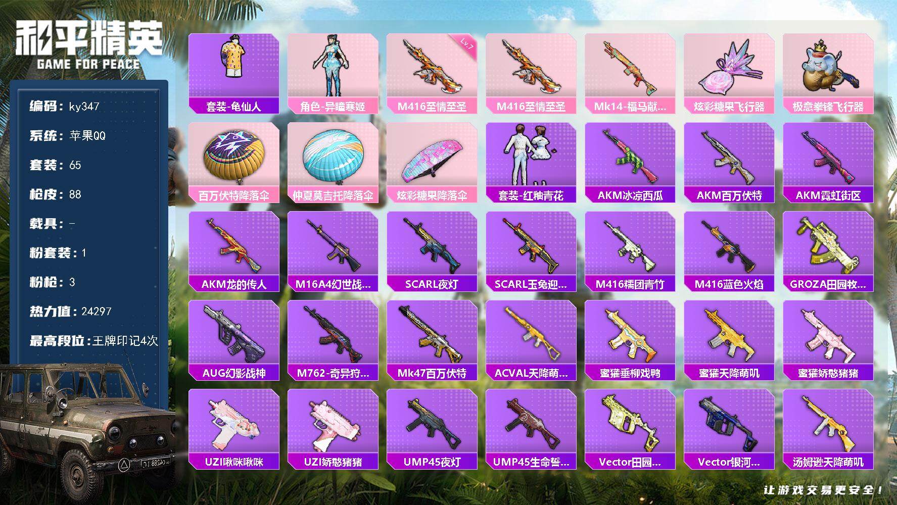 [16998473]苹果 手Q-1粉装-3特效枪-0载具-2粉色飞行器-24297热力值-4王牌印记-65套装-88枪皮