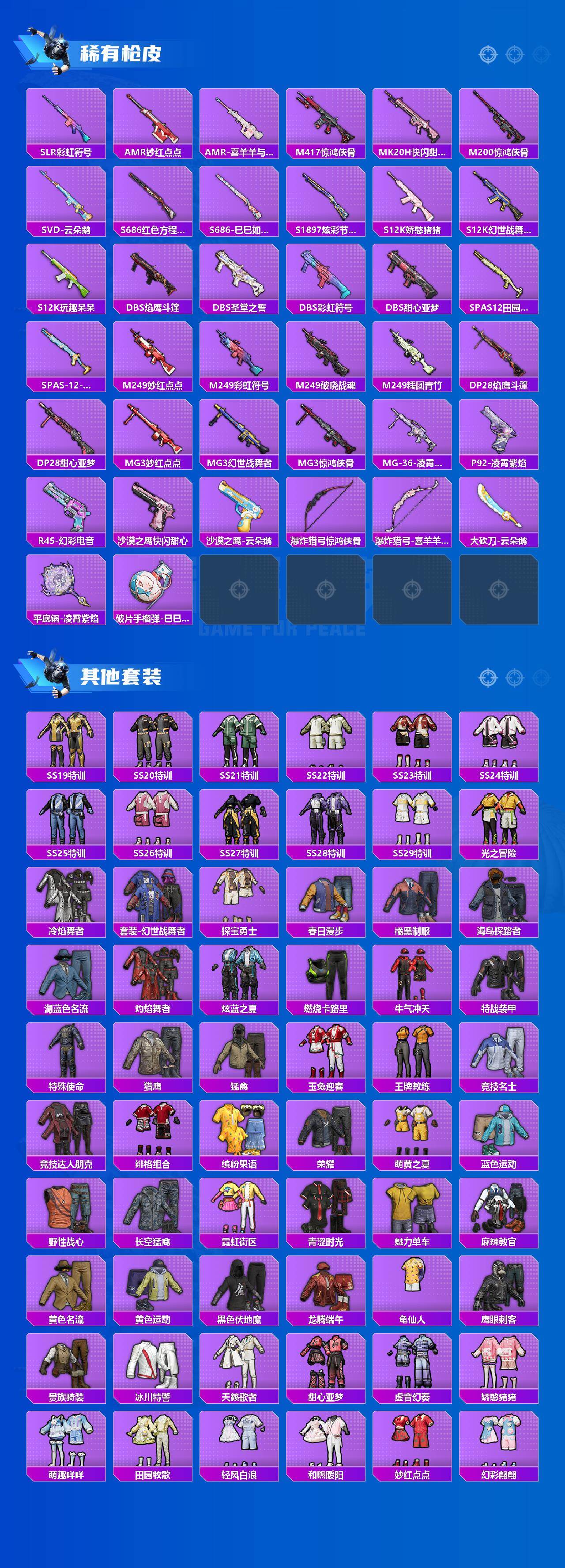 【稀有枪皮】:AKM-彩虹符号,AKM-灼热熔岩,AKM-破晓战魂,AKM-龙的传人,M16A4-幻世战舞者,M16A4-甜心亚梦,SCAR-L-夜灯,SCAR-L-玉兔迎春,SCAR-L-红色方程式,M416-糯团青竹,M416-红色方程式,M416-蓝色火焰,GROZA-彩虹符号,GROZA-田园牧歌,AUG-甜蜜菠萝,AUG-耀粉歌者,QBZ-洛神天依,M762-天降萌叽,M762-彩虹符号,M762-云朵鹅,Mk47-妙红点点,AC-VAL-天降萌叽,AC-VAL-快闪甜心,AC-VAL-甜心亚梦,蜜獾-垂柳戏鸭,蜜獾-天降萌叽,蜜獾-娇憨猪猪,ARX-凌霄紫焰,UZI-天降萌叽,UZI-娇憨猪猪,UZI-红色方程式,UMP45-涂山之恋,UMP45-生命誓言,UMP45-蓝色火焰,Vector-焰鹰斗篷,Vector-生命誓言,Vector-田园牧歌,Vector-创世·救赎,汤姆逊-天降萌叽,汤姆逊-奇异狩猎者,汤姆逊-炫彩节奏,汤姆逊-耀粉歌者,JS9-凌霄紫焰,P90-快闪甜心,P90-飞驰魅影,P90-巳巳如意,Kar98K-炫彩节奏,Kar98K-王子的夏天,AWM-焰鹰斗篷,VSS-彩虹符号,VSS-田园牧歌,Mini14-耀粉歌者,Mini14-绯穹魔姬,SLR-娇憨猪猪,SLR-