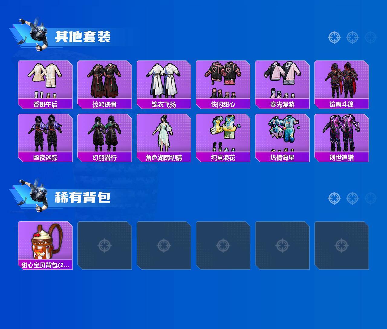 【稀有套装】:套装-龟仙人,套装-巳巳如意,套装-雏菊兔兔,套装-萝兰蝴蝶,套装-糖糖葫芦,套装-青团波波,套装-燕燕于飞,套装-鱼渊荷华,角色-风玲,套装-紫幽梦,套装-蓝冰羽,套装-云朵鹅,套装-雪绒豹,角色-绛羽幽主,套装-朱霞炽焰,套装-凌霄紫焰,角色-绯色魅影,角色-紫俏灵猫