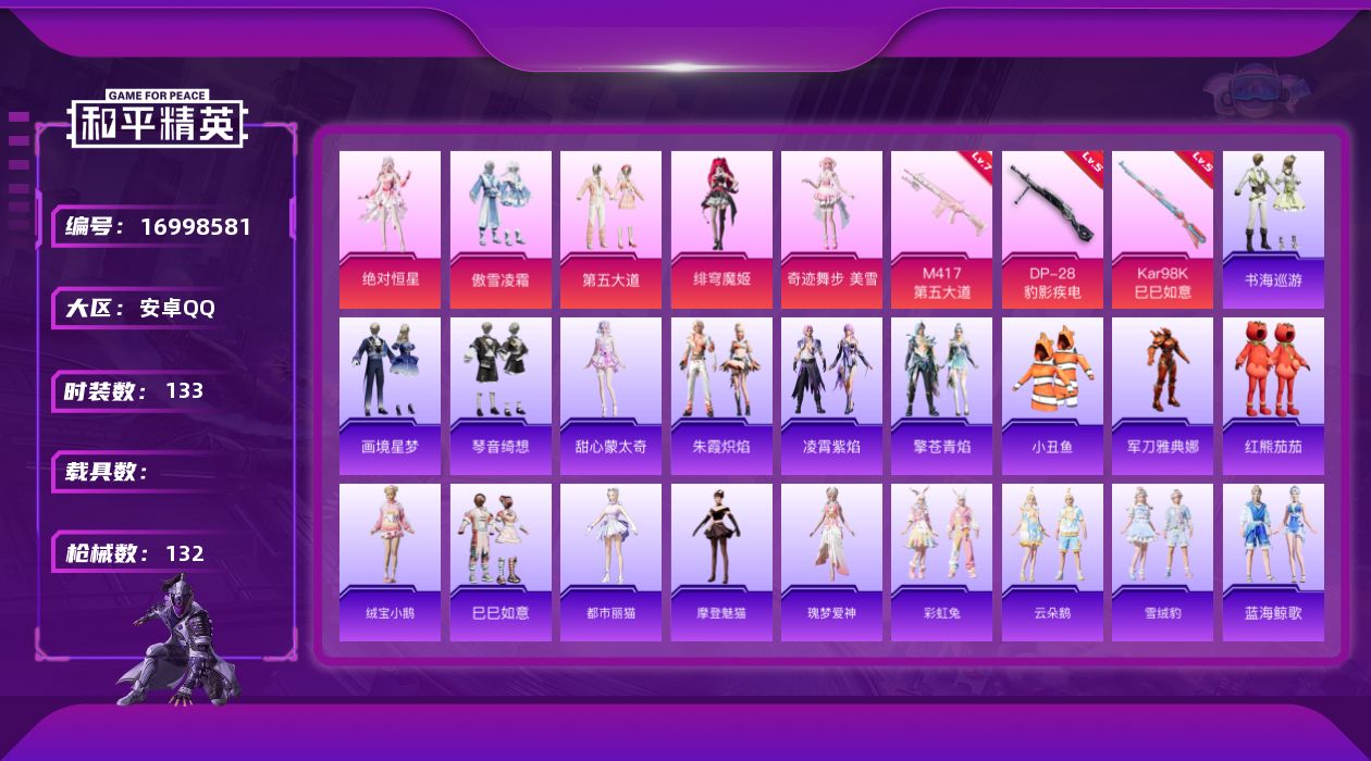 [16998581]安卓 手Q-5粉装-6特效枪-0载具-1粉色飞行器-42532热力值-6王牌印记-133套装-132枪皮