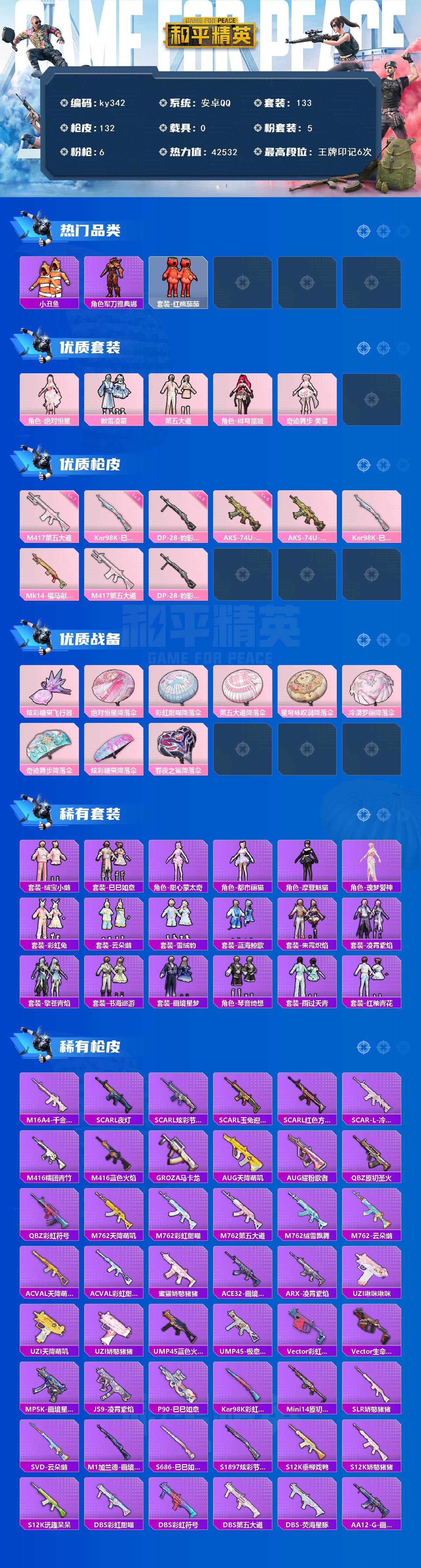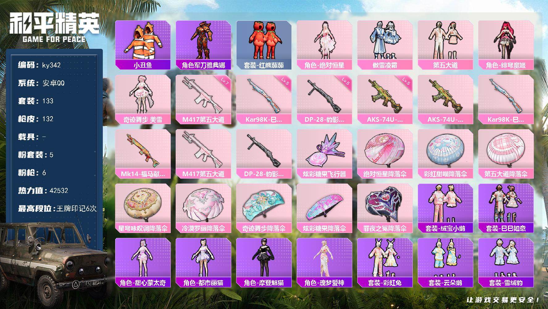 [16998581]安卓 手Q-5粉装-6特效枪-0载具-1粉色飞行器-42532热力值-6王牌印记-133套装-132枪皮 【热门品类】:套装-小丑鱼,角色-军刀雅典娜,套装-红熊茄茄 【粉色套装】:角色-绝对恒星,粉装-傲雪凌霜,粉装-第五大道,角色-绯穹魔姬,角色-奇迹舞步 美雪 【粉色枪皮等级】:AKS-74U-森灵之息(五级),Kar98K-巳巳如意(五级),M417-第五大道(七级),DP-28-豹影疾电(五级) 【粉色枪皮】:AKS-74U-森灵之息,Kar98K-巳巳如意,Mk14-福马献瑞,M417-第五大道,DP-28-豹影疾电 【粉色飞行器】:炫彩糖果飞行器 【粉色降落伞】:绝对恒星降落伞,彩虹甜喵降落伞,第五大道降落伞,星穹咏叹调降落伞,冷漠罗丽降落伞,奇迹舞步降落伞,炫彩糖果降落伞,罪夜之冕降落伞 【稀有套装】:套装-绒宝小鹅,套装-巳巳如意,角色-甜心蒙太奇,套装-雪国风尚,套装-炫彩糖果,角色-都市丽猫,角色-摩登魅猫,角色-瑰梦爱神,套装-彩虹兔,套装-云朵鹅,套装-雪绒豹,套装-蓝海鲸歌,套装-朱霞炽焰,套装-凌霄紫焰,套装-擎苍青焰,套装-书海巡游,套装-画境星梦,套装-琴音绮想,套装-雨过天青,套装-红釉青花 【稀有枪皮】:AUG-冰晶雪宝,M16A4-千金淑猫,SCAR-L-夜灯,SCAR-L-炫彩节奏,SCAR-L-玉兔迎春,SCAR-L-红色方程式,SCAR-L-冷漠罗丽,M416-糯团青竹,M416-蓝色火焰,GROZA-马卡龙,AUG-天降萌叽,AUG-耀粉歌者,QBZ-原初圣火,QBZ-彩虹符号,M762-天降萌叽,M762-彩虹甜喵,M762-第五大道,M762-绒雪飘舞,M762-云朵鹅,AC-VAL-天降萌叽,AC-VAL-彩虹甜喵,蜜獾-娇憨猪猪,ACE32-画境星梦,ARX-凌霄紫焰,UZI-啾咪啾咪,UZI-天降萌叽,UZI-娇憨猪猪,UMP45-蓝色火焰,UMP45-极意拳锋,Vector-彩虹符号,Vector-生命誓言,MP5K-画境星梦,JS9-凌霄紫焰,P90-巳巳如意,Kar98K-彩虹符号,Mini14-原初圣火,SLR-娇憨猪猪,SVD-云朵鹅,M1加兰德-画境星梦,S686-巳巳如意,S1897-炫彩节奏,S12K-玩趣呆呆,S12K-垂柳戏鸭,S12K-娇憨猪猪,DBS-彩虹甜喵,DBS-彩虹符号,DB