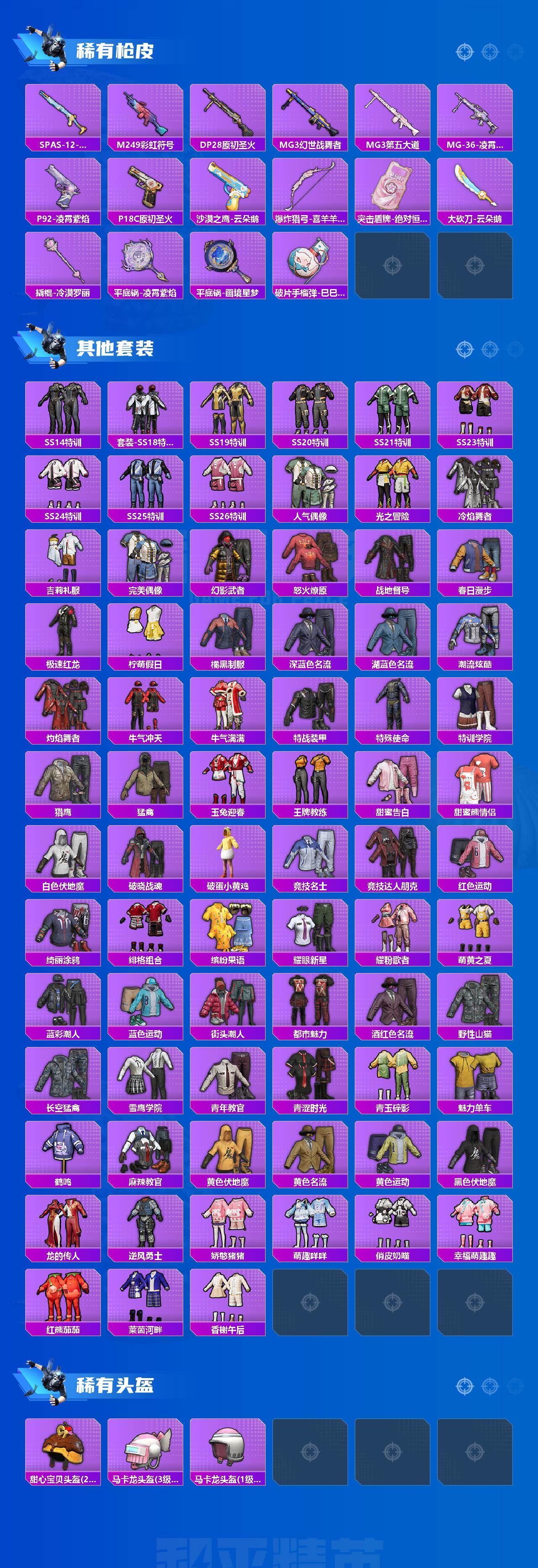 【稀有枪皮】:AUG-冰晶雪宝,M16A4-千金淑猫,SCAR-L-夜灯,SCAR-L-炫彩节奏,SCAR-L-玉兔迎春,SCAR-L-红色方程式,SCAR-L-冷漠罗丽,M416-糯团青竹,M416-蓝色火焰,GROZA-马卡龙,AUG-天降萌叽,AUG-耀粉歌者,QBZ-原初圣火,QBZ-彩虹符号,M762-天降萌叽,M762-彩虹甜喵,M762-第五大道,M762-绒雪飘舞,M762-云朵鹅,AC-VAL-天降萌叽,AC-VAL-彩虹甜喵,蜜獾-娇憨猪猪,ACE32-画境星梦,ARX-凌霄紫焰,UZI-啾咪啾咪,UZI-天降萌叽,UZI-娇憨猪猪,UMP45-蓝色火焰,UMP45-极意拳锋,Vector-彩虹符号,Vector-生命誓言,MP5K-画境星梦,JS9-凌霄紫焰,P90-巳巳如意,Kar98K-彩虹符号,Mini14-原初圣火,SLR-娇憨猪猪,SVD-云朵鹅,M1加兰德-画境星梦,S686-巳巳如意,S1897-炫彩节奏,S12K-玩趣呆呆,S12K-垂柳戏鸭,S12K-娇憨猪猪,DBS-彩虹甜喵,DBS-彩虹符号,DB