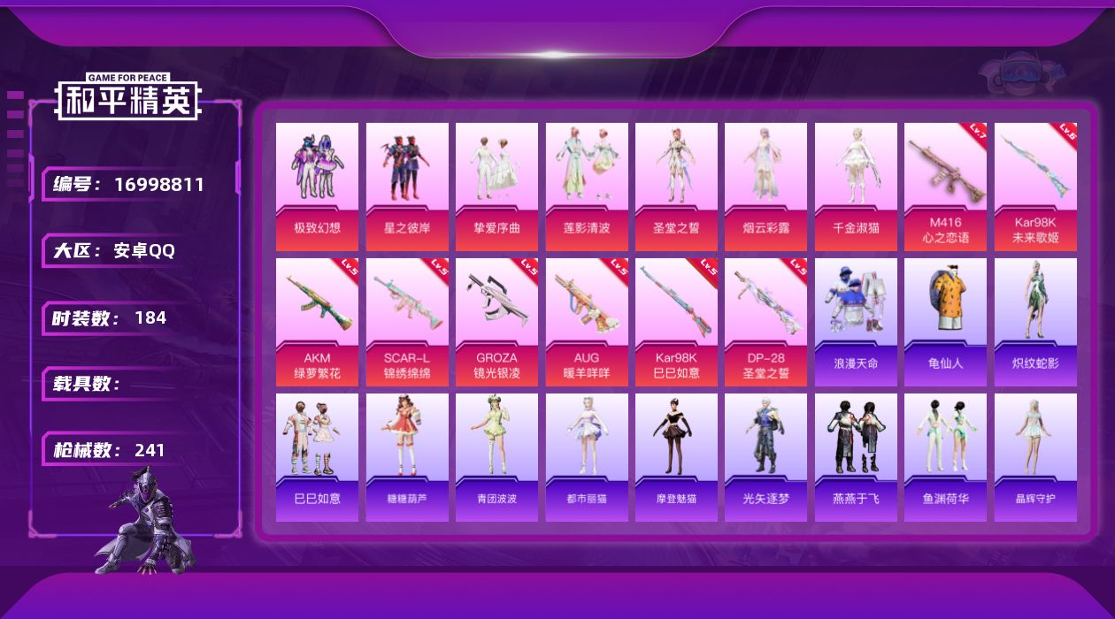 [16998811]安卓 手Q-7粉装-9特效枪-0载具-4粉色飞行器-77085热力值-9王牌印记-184套装-241枪皮
