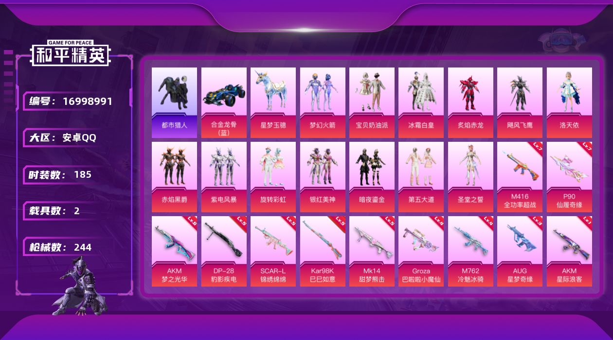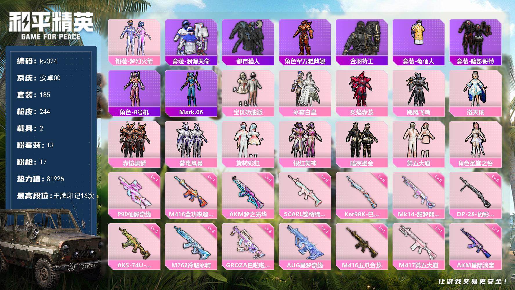 [16998991]安卓 手Q-13粉装-17特效枪-2载具-3粉色飞行器-81925热力值-16王牌印记-185套装-244枪皮