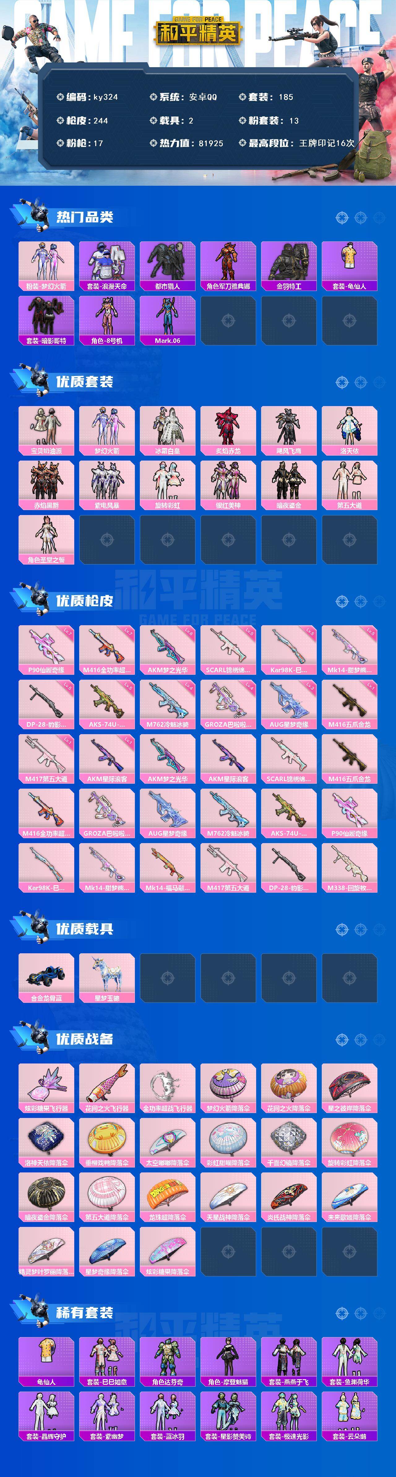 [16998991]安卓 手Q-13粉装-17特效枪-2载具-3粉色飞行器-81925热力值-16王牌印记-185套装-244枪皮 【热门品类】:粉装-梦幻火箭,套装-浪漫天命,套装-都市猎人,角色-军刀雅典娜,套装-金羽特工,套装-龟仙人,套装-暗影哥特,角色-8号机,角色-Mark.06 【粉色套装】:粉装-宝贝奶油派,粉装-梦幻火箭,粉装-冰霜白皇,粉装-炙焰赤龙,粉装-飓风飞鹰,角色-洛天依,粉装-赤焰黑爵,粉装-紫电风暴,粉装-旋转彩虹,粉装-银红美神,粉装-暗夜鎏金,粉装-第五大道,角色-圣堂之誓 【粉色枪皮等级】:AKM-梦之光华(六级),AKM-星际浪客(一级),SCAR-L-锦绣绵绵(五级),M416-五爪金龙(一级),M416-全功率超战(七级),GROZA-巴啦啦小魔仙(四级),AUG-星梦奇缘(三级),M762-冷魅冰骑(四级),AKS-74U-森灵之息(五级),P90-仙履奇缘(七级),Kar98K-巳巳如意(五级),Mk14-甜梦熊击(五级),M417-第五大道(一级),DP-28-豹影疾电(五级) 【粉色载具】:合金龙骨(蓝),星梦玉骢 【粉色枪皮】:AKM-梦之光华,AKM-星际浪客,SCAR-L-锦绣绵绵,M416-五爪金龙,M416-全功率超战,GROZA-巴啦啦小魔仙,AUG-星梦奇缘,M762-冷魅冰骑,AKS-74U-森灵之息,P90-仙履奇缘,Kar98K-巳巳如意,Mk14-甜梦熊击,Mk14-福马献瑞,M417-第五大道,DP-28-豹影疾电,M338-回旋牧梦使 【粉色飞行器】:炫彩糖果飞行器,花间之火飞行器,全功率超战飞行器 【粉色降落伞】:梦幻火箭降落伞,花间之火降落伞,星之彼岸降落伞,洛神天依降落伞,垂柳戏鸭降落伞,太空嘟嘟降落伞,彩虹甜喵降落伞,千面幻镜降落伞,旋转彩虹降落伞,暗夜鎏金降落伞,第五大道降落伞,龙珠超降落伞,天星战神降落伞,炎氏战神降落伞,未来歌姬降落伞,精灵梦叶罗丽降落伞,星梦奇缘降落伞,炫彩糖果降落伞 【稀有套装】:套装-龟仙人,套装-巳巳如意,套装-雪国风尚,套装-炫彩糖果,角色-达芬奇,角色-摩登魅猫,套装-燕燕于飞,套装-鱼渊荷华,套装-晶辉守护,套装-紫幽梦,套装-蓝冰羽,套装-星影赞美诗,套装-极速光影,套装-云朵鹅,套装-雪绒豹,套装-书海巡游,套装-画境星梦,套装-琴音绮想,套装-雨过天青,套装