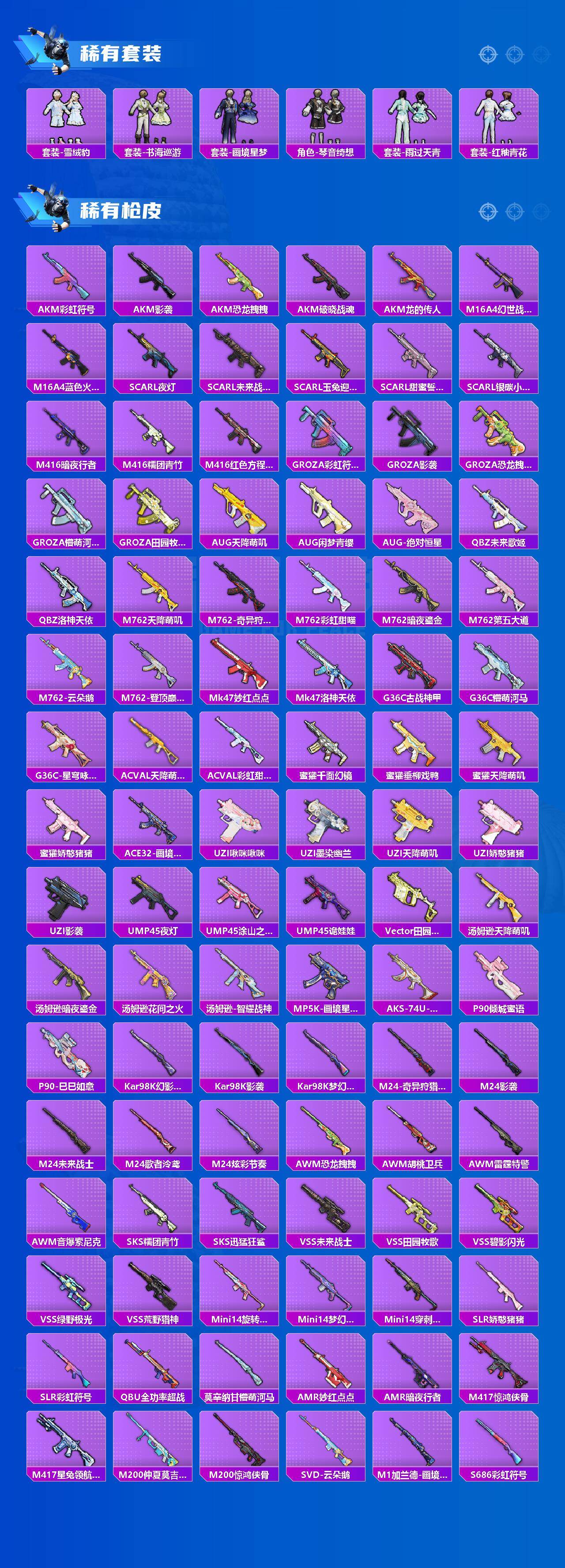AKM-梦之光华,AKM-星际浪客,SCAR-L-锦绣绵绵,M416-五爪金龙,M416-全功率超战,GROZA-巴啦啦小魔仙,AUG-星梦奇缘,M762-冷魅冰骑,P90-仙履奇缘,Kar98K-巳巳如意,M417-第五大道