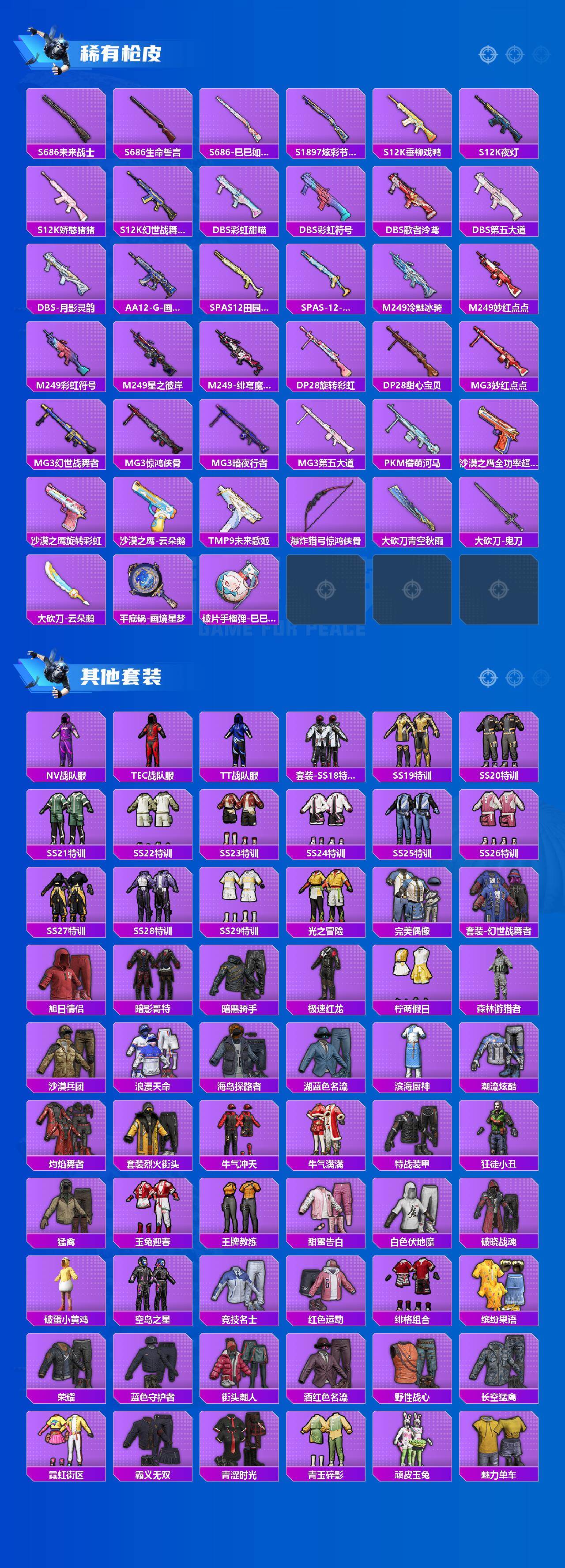 - [11324541]4粉装 9特效枪 2载具 4印记 可二次 可修改实名 身法装备:初号机 觉醒Ver.(新紫螳螂),8号机(新粉螳螂),Mark.06(新蓝螳螂) 优质装备:阿斯顿·马丁DBS(红),路特斯ELETRE(冰川蓝),香水柠檬,Groza香水柠檬,P90-电糖天使,M416墨龙九天,六级M416-墨龙九天,AMR鸢尾晶梦,M200梦海之灵,UMP45量子极限,M762-青锋波束,Kar98K-巳巳如意 热门装扮:齐天大圣,星空武士,初号机 觉醒Ver.(新紫螳螂),迅捷狂鲨,呆萌铁蟹 稀有枪皮:DP-28-豹影疾电 六级特效枪:六级GROZA-香水柠檬 五级特效枪:五级M762-青锋波束,五级UMP45-量子极限,五级AMR-鸢尾晶梦 四级特效枪:四级Kar98K-巳巳如意 三级特效枪:三级P90-电糖天使,三级M200-梦海之灵,三级DP-28-豹影疾电 紫色装扮:SS31特训套装,旭日情侣,SS30特训套装,SS33特训套装,顶瓜瓜,冰爽海盐,浪漫樱花,军刀雅典娜,长空猛禽,雪山精英,蜜露汐语,魅力单车,龟仙人,冰河战士,龙魂突击队,蝶变,香桃花海,暗金炫舞,猛禽,小熊娃娃,雏菊兔兔,萝兰蝴蝶,SS29特训,极冰使者,星途旅人,纯真浪花,热情海星,曼妙人鱼,卖崽青蛙,铁血战翼,8号机(新粉螳螂),Mark.06(新蓝螳螂),冰公主,异域银装,竞技名士,粉红小猪,焰鹰斗篷,幻羽潜行,大橘大利,SS32特训服(SS32特训套装),绯格组合,光之冒险 优质战备:鸢尾晶梦降落伞,霓虹漫游降落伞,绮梦流光降落伞,墨龙九天降落伞,龙翔九天飞行器,精灵梦叶罗丽降落伞,初号机 觉醒Ver.降落伞,星途旅人降落伞,深渊漩涡飞行器,江南烟雨降落伞,香水柠檬降落伞