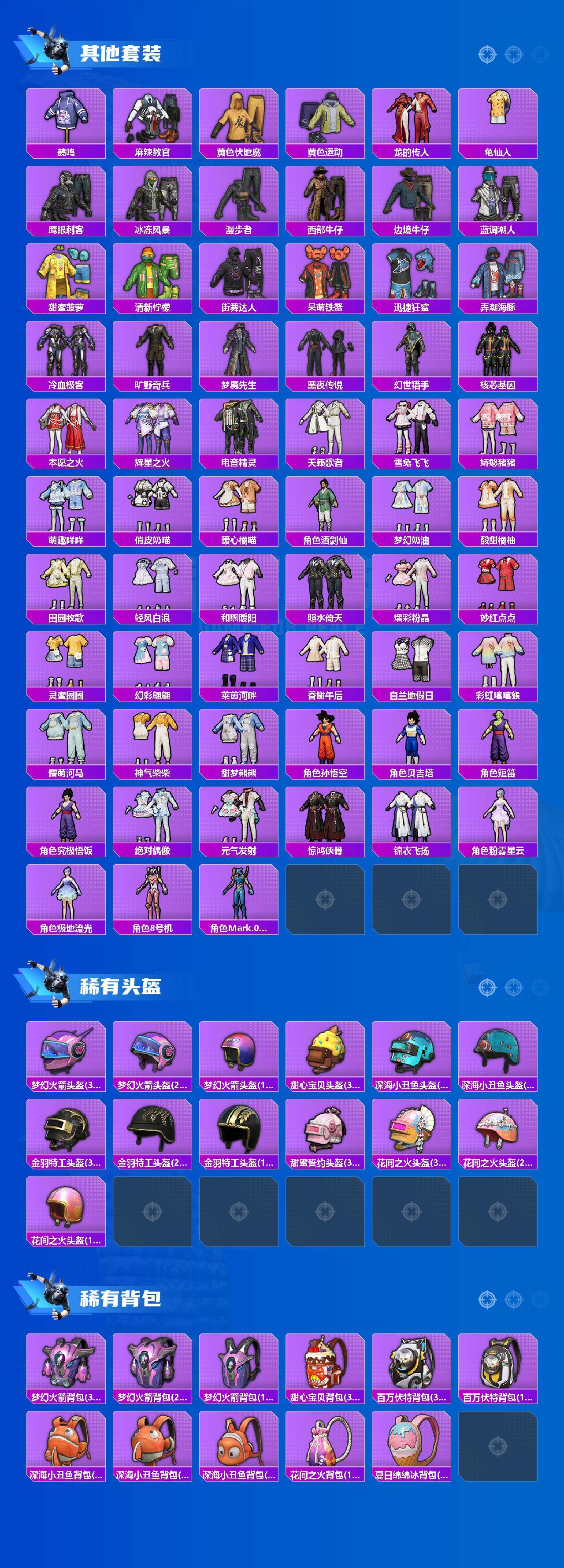 套装-梦幻火箭,套装-都市猎人,套装-宝贝奶油派,套装-炙焰赤龙,套装-飓风飞鹰,角色-洛天依,套装-赤焰黑爵,套装-紫电风暴,套装-旋转彩虹,套装-银红美神,套装-暗夜鎏金,套装-第五大道,角色-圣堂之誓,套装-狂徒小丑,套装-鹰眼刺客,套装-呆萌铁蟹,套装-迅捷狂鲨,套装-梦魇先生