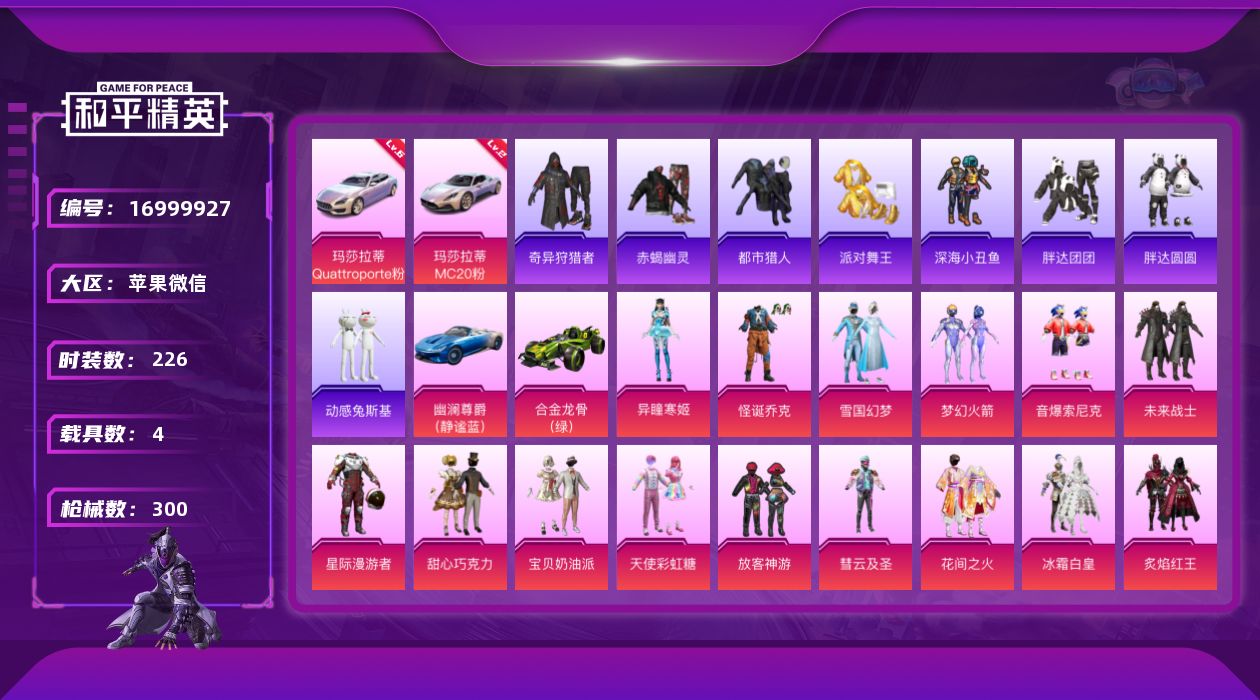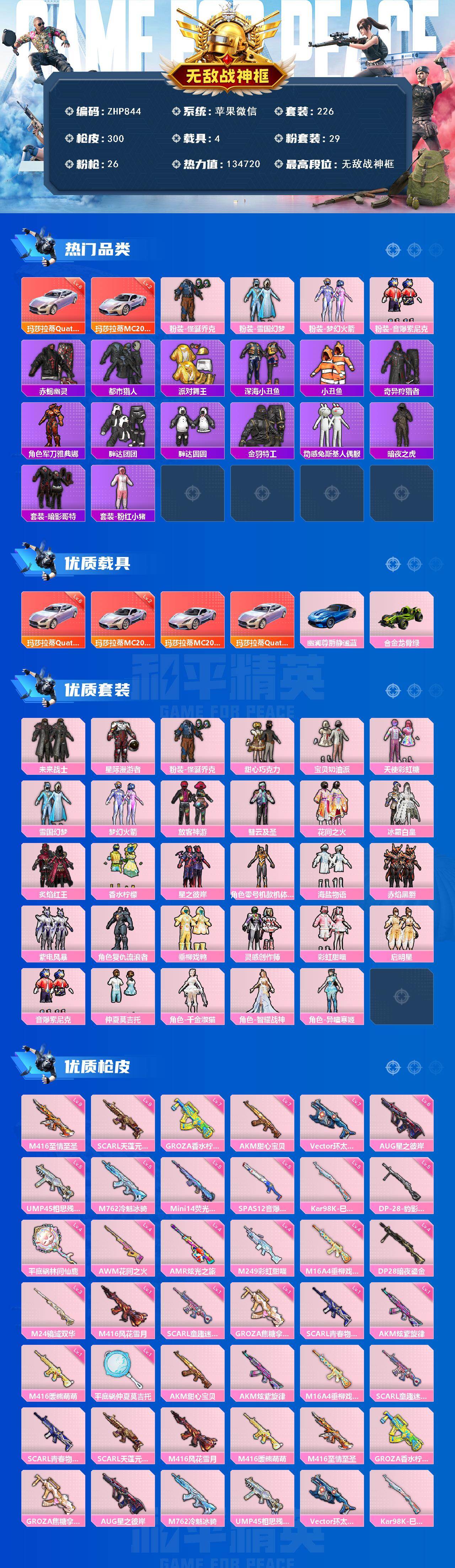 [16999927]苹果 微信-无敌战神框-29粉装-26特效枪-4载具-12粉色飞行器-134720热力值-19王牌印记-226套装-300枪皮 【红色载具】:玛莎拉蒂MC20(幻星粉)(二级),玛莎拉蒂Quattroporte(幻星粉)(六级) 【热门品类】:粉装-怪诞乔克,粉装-雪国幻梦,粉装-梦幻火箭,粉装-音爆索尼克,套装-赤蝎幽灵,套装-都市猎人,套装-派对舞王,套装-深海小丑鱼,套装-小丑鱼,套装-奇异狩猎者,角色-军刀雅典娜,套装-胖达团团,套装-胖达圆圆,套装-金羽特工,套装-动感兔斯基人偶服,套装-暗夜之虎,套装-暗影哥特,套装-粉红小猪 【粉色套装】:粉装-未来战士,粉装-星际漫游者,粉装-怪诞乔克,粉装-甜心巧克力,粉装-宝贝奶油派,粉装-天使彩虹糖,粉装-雪国幻梦,粉装-梦幻火箭,粉装-放客神游,粉装-彗云及圣,粉装-花间之火,粉装-冰霜白皇,粉装-炙焰红王,粉装-香水柠檬,粉装-星之彼岸,角色-零号机款机体服,粉装-海盐物语,粉装-赤焰黑爵,粉装-紫电风暴,角色-复仇流浪者,粉装-垂柳戏鸭,粉装-灵感创作师,粉装-彩虹甜喵,粉装-启明星,粉装-音爆索尼克,粉装-仲夏莫吉托,角色-千金淑猫,角色-智耀战神,角色-异瞳寒姬 【粉色枪皮等级】:AKM-甜心宝贝(七级),AKM-炫紫旋律(一级),M16A4-垂柳戏鸭(四级),SCAR-L-童趣迷兔(一级),SCAR-L-青春物语(一级),SCAR-L-天蓬元帅(九级),M416-风花雪月(一级),M416-暖熊萌萌(一级),M416-至情至圣(九级),GROZA-香水柠檬(七级),GROZA-焦糖拿铁(一级),AUG-星之彼岸(六级),M762-冷魅冰骑(五级),UMP45-相思残雪(五级),Vector-环太平洋(七级),Kar98K-巳巳如意(五级),M24-镜域双华(三级),AWM-花间之火(四级),Mini14-荧光虫舞(五级),AMR-炫光之旅(四级),SPAS-12-音爆索尼克(五级),M249-彩虹甜喵(四级),DP-28-暗夜鎏金(四级),DP-28-豹影疾电(五级),平底锅-林间仙鹿(四级),平底锅-仲夏莫吉托(一级) 【粉色载具】:玛莎拉蒂MC20(幻星粉),玛莎拉蒂Quattroporte(幻星粉),幽澜尊爵(静谧蓝),合金龙骨(绿) 【粉色枪皮】:AKM-甜心宝贝,AKM-炫紫旋律,M16