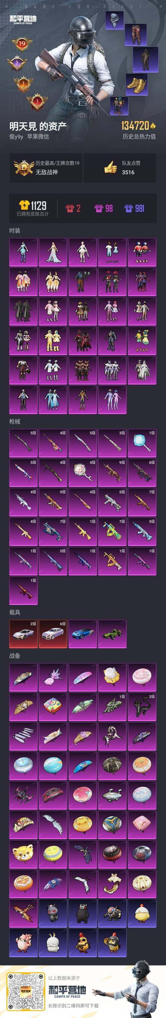 [16999927]苹果 微信-无敌战神框-29粉装-26特效枪-4载具-12粉色飞行器-134720热力值-19王牌印记-226套装-300枪皮