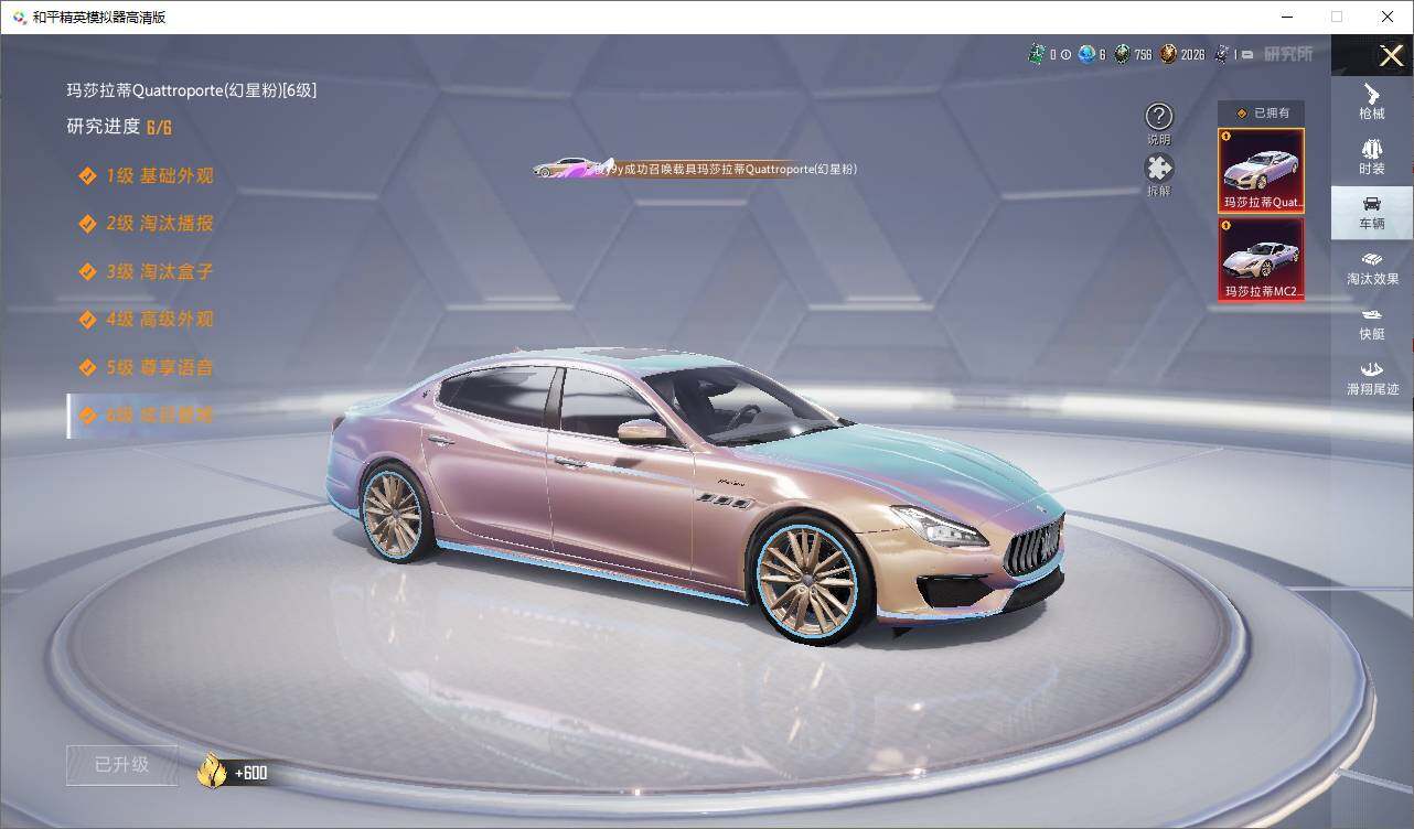 【红色载具】:玛莎拉蒂MC20(幻星粉)(二级),玛莎拉蒂Quattroporte(幻星粉)(六级)