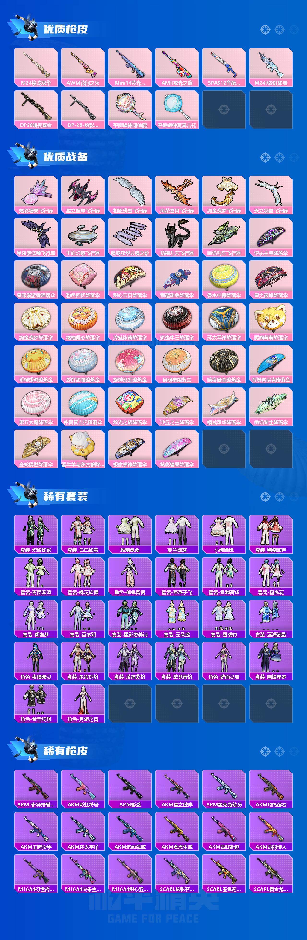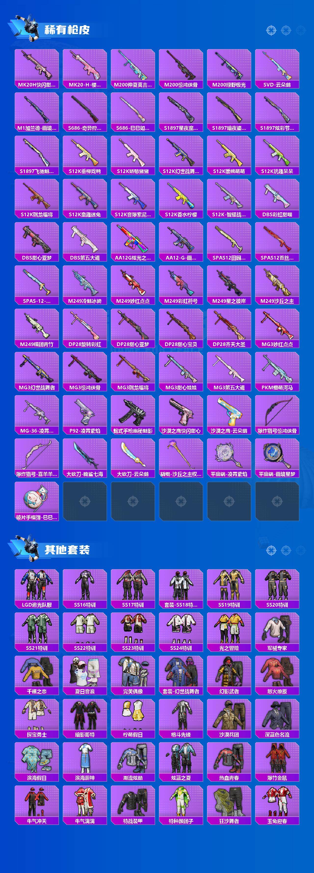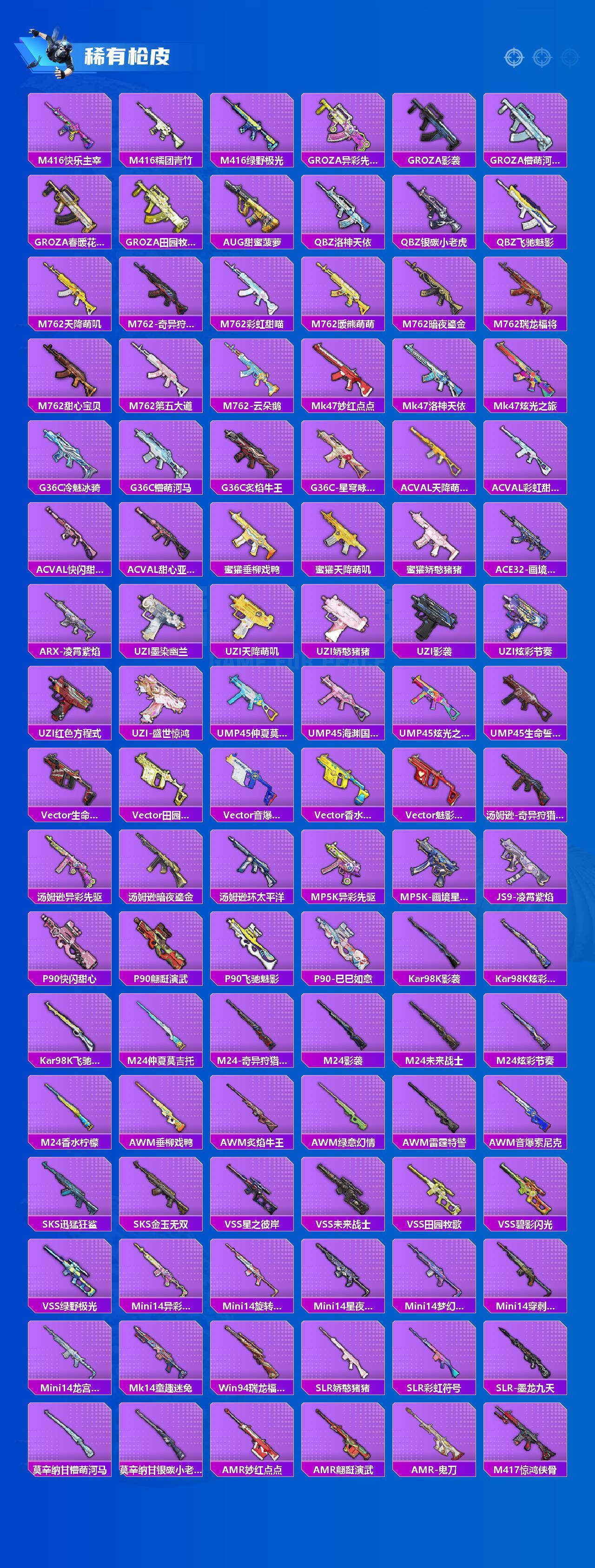 AKM-甜心宝贝,AKM-炫紫旋律,M16A4-垂柳戏鸭,SCAR-L-童趣迷兔,SCAR-L-青春物语,SCAR-L-天蓬元帅,M416-风花雪月,M416-暖熊萌萌,M416-至情至圣,GROZA-香水柠檬,GROZA-焦糖拿铁,AUG-星之彼岸,M762-冷魅冰骑,UMP45-相思残雪,Vector-环太平洋,Kar98K-巳巳如意,M24-镜域双华,AWM-花间之火,Mini14-荧光虫舞,AMR-炫光之旅,SPAS-12-音爆索尼克,M249-彩虹甜喵,DP-28-暗夜鎏金,平底锅-林间仙鹿,平底锅-仲夏莫吉托