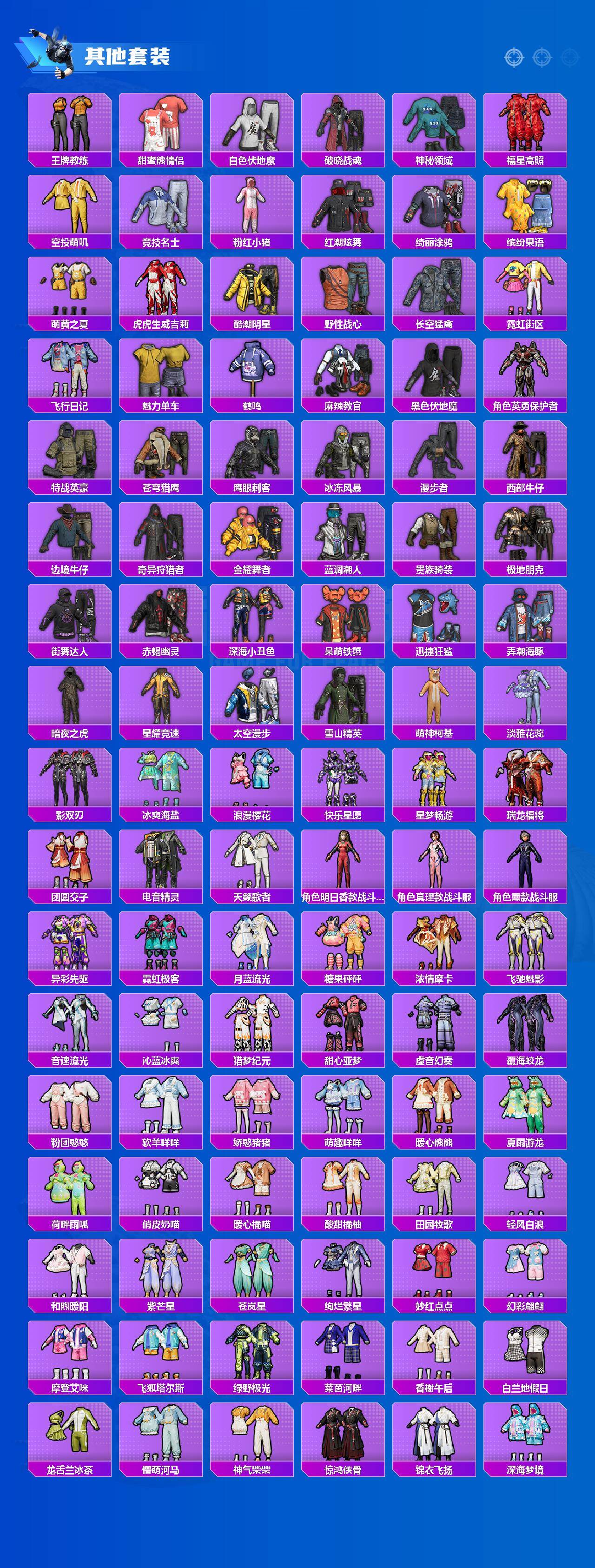 【粉色套装】:粉装-未来战士,粉装-星际漫游者,粉装-怪诞乔克,粉装-甜心巧克力,粉装-宝贝奶油派,粉装-天使彩虹糖,粉装-雪国幻梦,粉装-梦幻火箭,粉装-放客神游,粉装-彗云及圣,粉装-花间之火,粉装-冰霜白皇,粉装-炙焰红王,粉装-香水柠檬,粉装-星之彼岸,角色-零号机款机体服,粉装-海盐物语,粉装-赤焰黑爵,粉装-紫电风暴,角色-复仇流浪者,粉装-垂柳戏鸭,粉装-灵感创作师,粉装-彩虹甜喵,粉装-启明星,粉装-音爆索尼克,粉装-仲夏莫吉托,角色-千金淑猫,角色-智耀战神,角色-异瞳寒姬