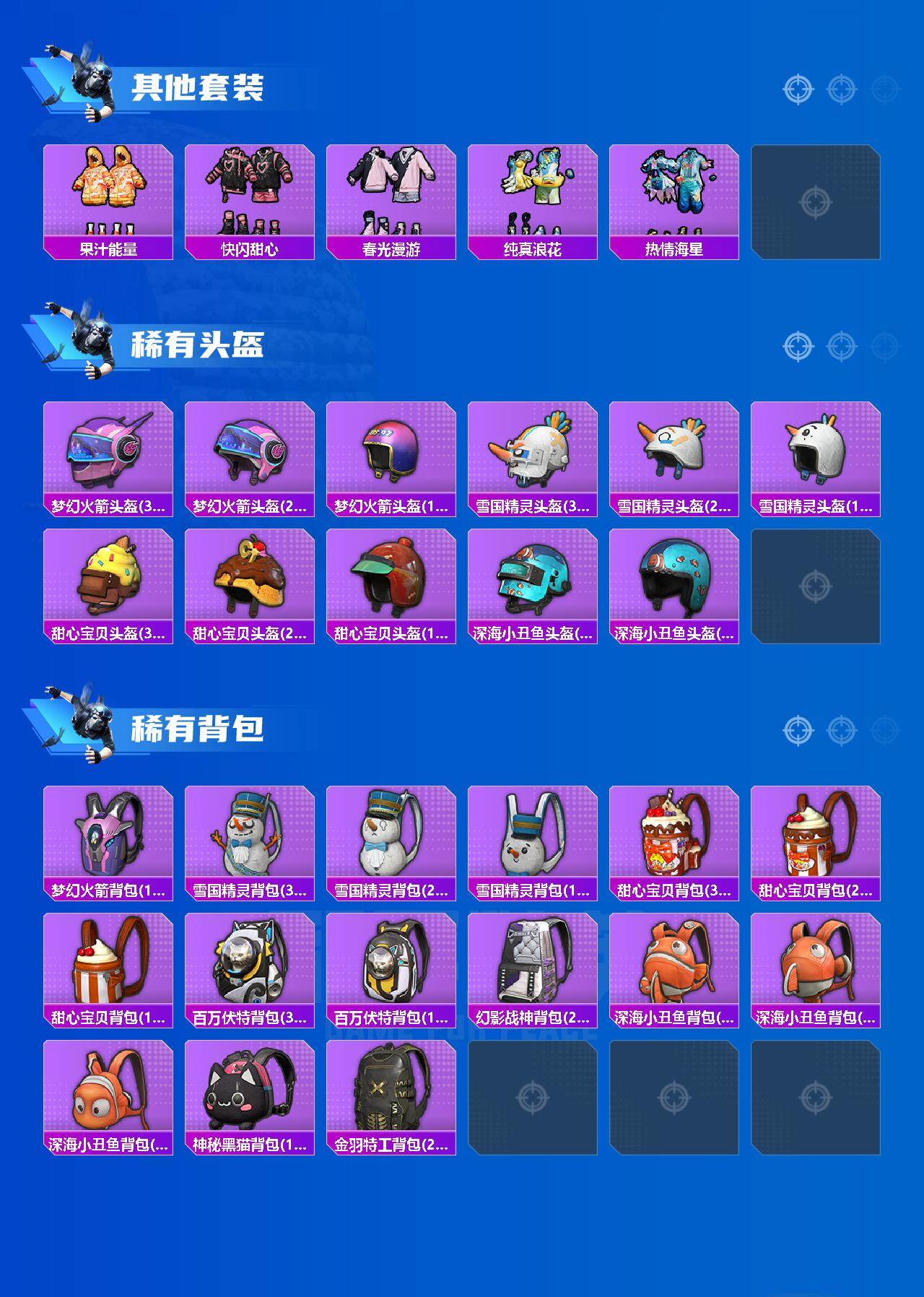 套装-怪诞乔克,套装-雪国幻梦,套装-梦幻火箭,套装-音爆索尼克,套装-赤蝎幽灵,套装-都市猎人,套装-派对舞王,套装-深海小丑鱼,套装-奇异狩猎者,套装-胖达团团,套装-胖达圆圆,套装-未来战士,套装-星际漫游者,套装-宝贝奶油派,套装-天使彩虹糖,套装-放客神游,套装-彗云及圣,套装-花间之火,套装-炙焰红王,套装-香水柠檬,套装-星之彼岸,角色-零号机款机体服,套装-海盐物语,套装-赤焰黑爵,套装-紫电风暴,角色-复仇流浪者,套装-垂柳戏鸭,套装-灵感创作师,套装-彩虹甜喵,套装-启明星,套装-仲夏莫吉托,角色-千金淑猫,套装-鹰眼刺客,套装-呆萌铁蟹,套装-迅捷狂鲨,套装-萌神柯基