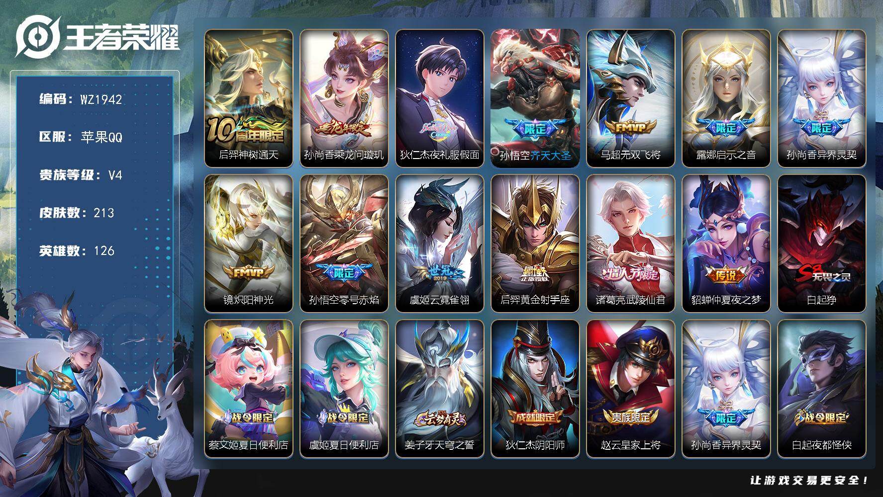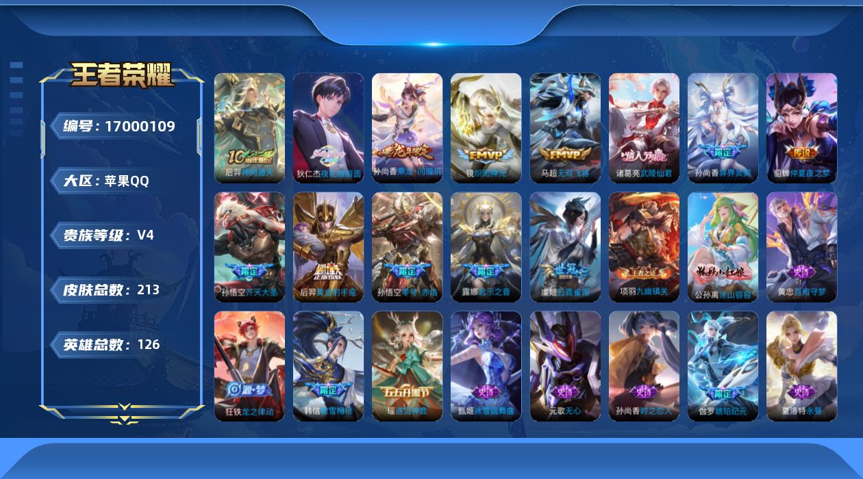 - [12196226]V8 1典藏 1无双 16传说 123英雄 274皮肤 可修改实名 优质装备:鸣剑·曳影,韩信群星魔术团(韩信无双),久胜战神,炽阳神光,末日机甲-孙尚香(绿蚂蚱),地狱火,仲夏夜之梦(大飞蛾),山海·炽霜斩(李信年限),山海·苍雷引(电光曜子),鹤羽星尊,妄想实况,澜逐花归海,涂山容容 传说皮:乘龙·淬吴钩(孙策年限) 珍宝阁皮:玩趣恶龙 限定皮:逐霄战戟,鸣野蒿,至尊宝,白虎志(电光耗子),凤求凰(白切鸡),神威(电光马子),诗剑行,五谷丰年,青龙志(铠年限),冰锋战神,天狼狩猎者,龙胆,朱雀志(守约年限),圣诞老人,一生所爱,大圣娶亲,青春决赛季,山海·玄木吟(马可年限) 史诗皮:怒海争锋,紫霞仙子,白龙吟,黄金分割率,特工魅影,千年之狐,江河有灵,魅语,蒙恬荣光圣徽,冰冠公主,偶像歌手,电玩·爆裂旋风,末日机甲-吕布,猫狗日记-孙策,猫狗日记-大乔,乱世虎臣,节奏热浪,修罗,女仆咖啡,摇滚巨星,水果甜心,星夜王子,功夫厨神,德古拉伯爵,暗隐猎兽者,鬼剑武藏,心灵战警,天秀·启明,舞动绿茵,缤纷独角兽,乘风破浪,逐浪之夏,月团寄思,水晶猎龙者,箭羽风息,金属风暴,原初追逐者,圣诞狂欢,圣诞恋歌,鹰眼统帅,黎明之约,赏金猎手,无心,未来纪元-赵云